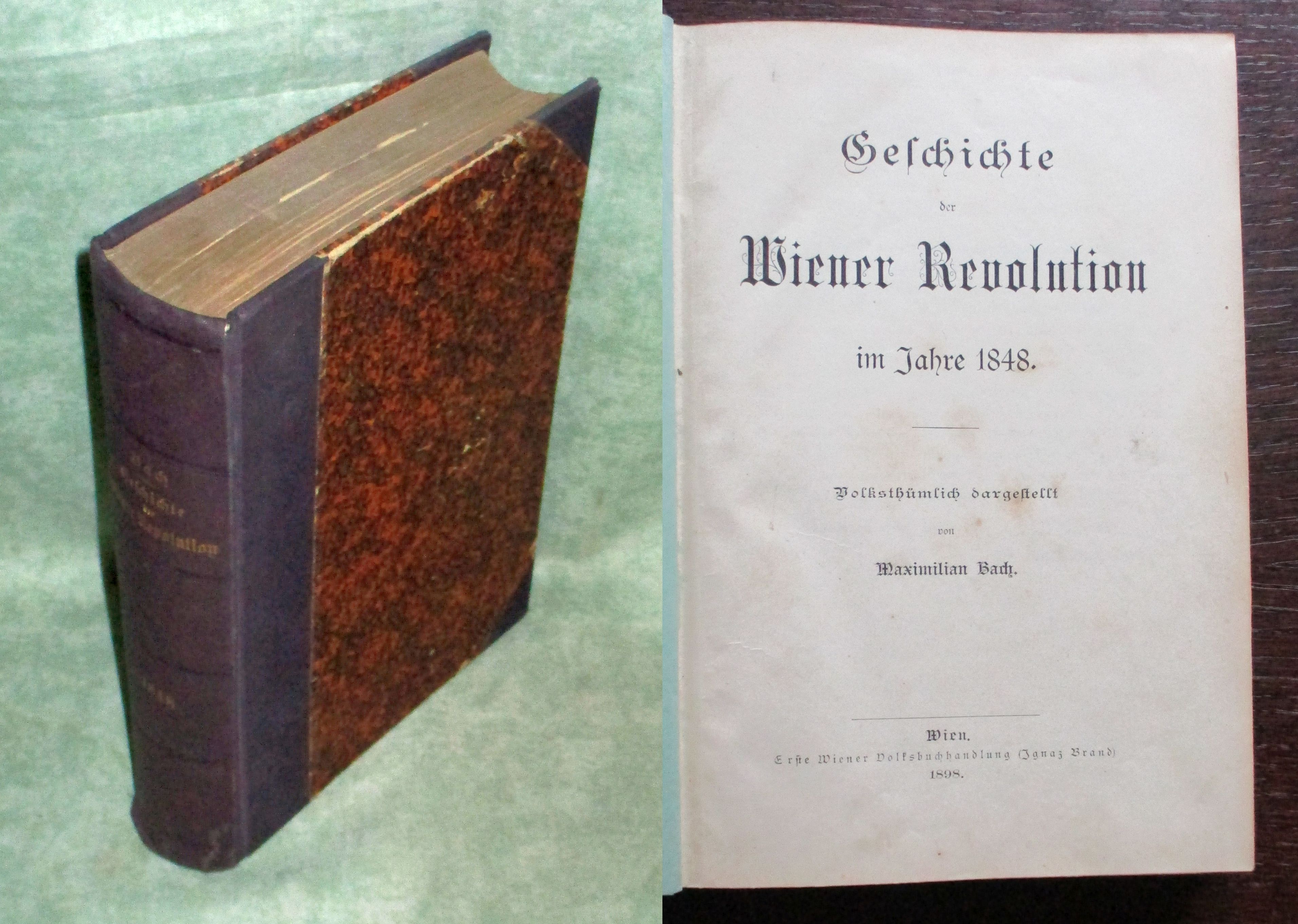 Österreich – Geschichte – Zeitgeschichte Bach, Maximilian. Geschichte der Wiener Revolution im Jahre 1848. Volksthümlich dargestellt. Wien. Erste Wiener Volksbuchhandlung (Ignaz Brand) 1898. XV. 942 Seiten. Zahlr. Abb., 4 ausklappbare Beilagen. Bibliothekshalbleinen der Zeit mit goldgepr. Rücken. Leicht berieben und bestoßen.