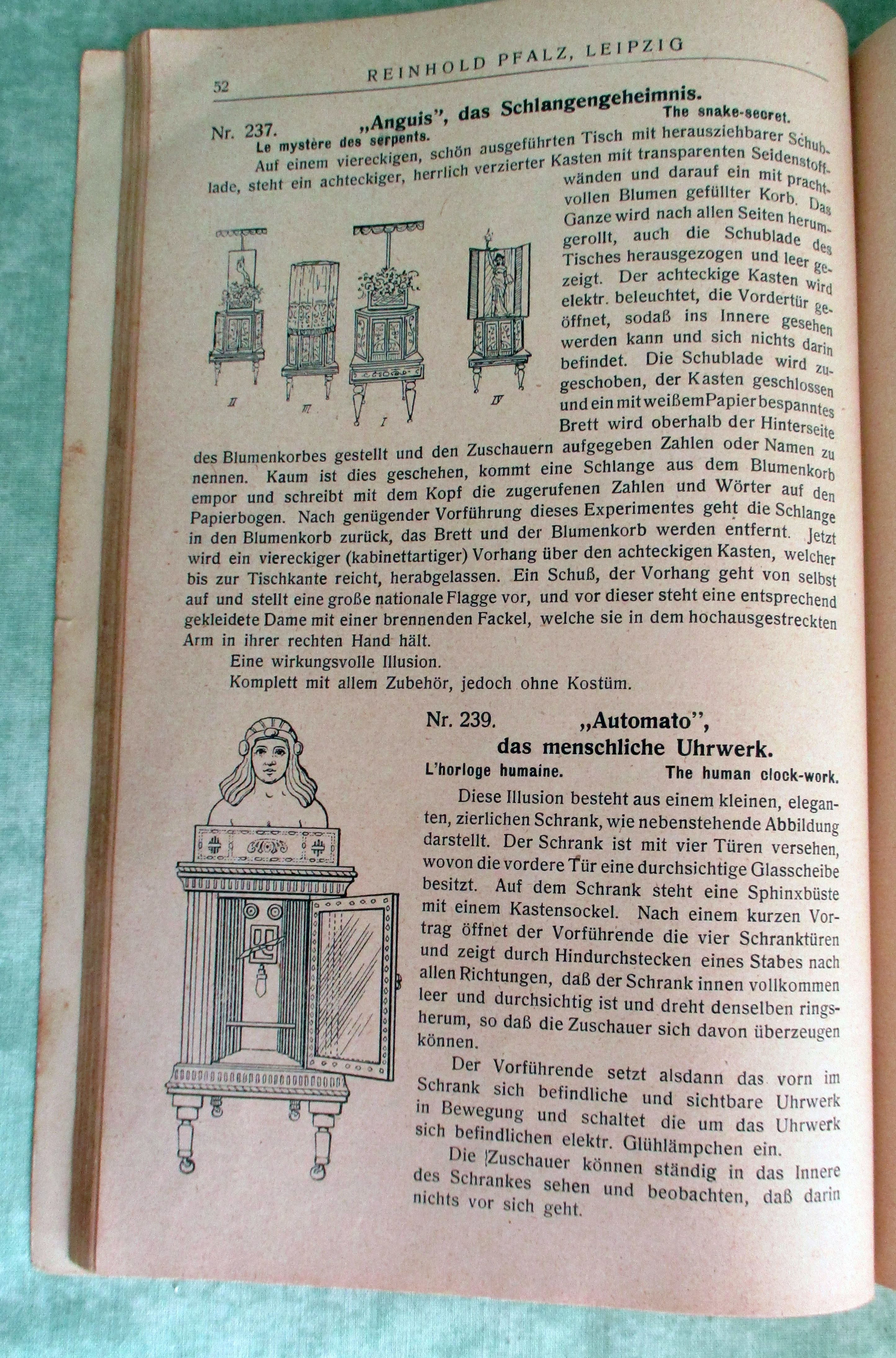 Obwohl kein Erscheinungsdatum verzeichnet ist, ist der Katalog ziemlich genau zu datieren, da der Katalog ursprünglich von der Leipziger Fa. Reinhold Pfalz produziert wurde, die 1930 von Horst Lange (Künstlername Manfredo), dem Vorsitzenden des Magischen Zirkels Dresden übernommen wurde. Der Katalog umfaßt insgesamt 539 Nummern, wobei das gesamte Repertoire damaliger Zauberkunst – von Gladius dem Schwerterkasten bis zur schwebenden Jungfrau – beinhaltet ist.