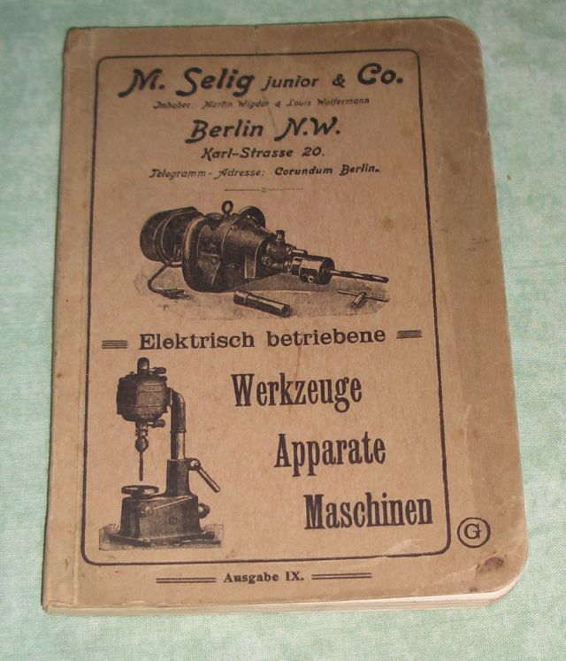 Firmengeschichte + Firmenkataloge M. Selig junior & Co. Inhaber: Martin Wigdor & Louis Wolfermann. Berlin N.W. Karl-Strasse 20 Elektrisch betriebene Werkzeuge – Apparate – Maschinen. Ausgabe IX. Um 1905. 11 x 15. 144 Seiten, durchgehend illustriert. Kart. Einband leicht staubfleckig, innen einwandfrei!