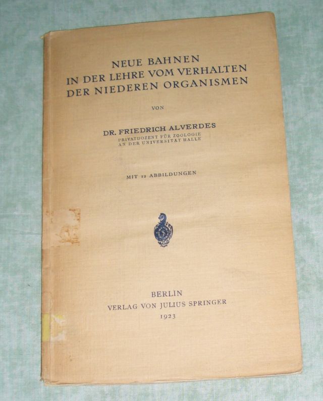 Zoologie Alverdes, Friedrich. Neue Bahnen in der Lehre vom Verhalten der niederen Organismen. Berlin. Julius Springer. 1922. 8. IV, 64 Seiten, 12 Abb. Brosch. ExBibliotheksex. aus der Kekulébibliothek der Farbenfabriken Bayer mit Exlibris und Stempeln. Insgesamt leicht wellig.