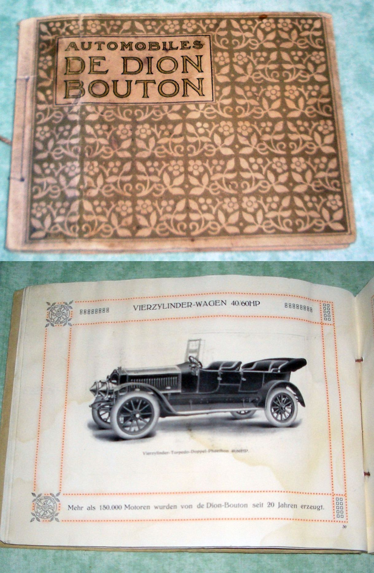 Auto + Motorrad Automobiles de Dion Bouton. Modelle 1912. Fabrikate der Etablissements der Dion.Bouton Akt.-Ges. 48 Seiten, durchgehend illustriert. Kart. – Kordelbindung. Einband leicht fleckig mit Knickfalte, zahlr. Seiten leicht wasserfleckig.Insgesami in sammelwürdigem Zustand! De Dion-Bouton war ein französischer Fahrzeughersteller. Zu Beginn des 20. Jahrhunderts war De Dion-Bouton eine der erfolgreichsten Automobilmarken.
