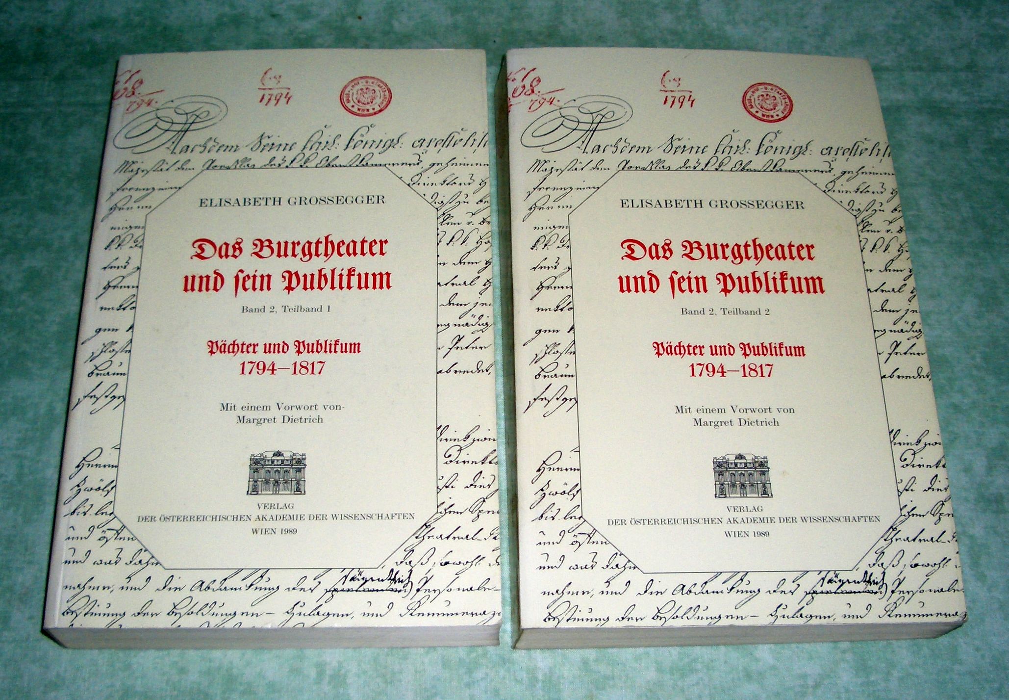 Österr. Musik-, Literatur- und Theatergeschichte Grossegger, Elisabeth. Das Burgtheater und sein Publikum. Pächter und Publikum 1794-1817. 2 Bände. Wien. Vlg. d. Akademie d. Wissenschaften. 1989. 945 Seiten. Paperback. Das Burgtheater und sein Publikum. Band 2, Teilband 1 u. 2.