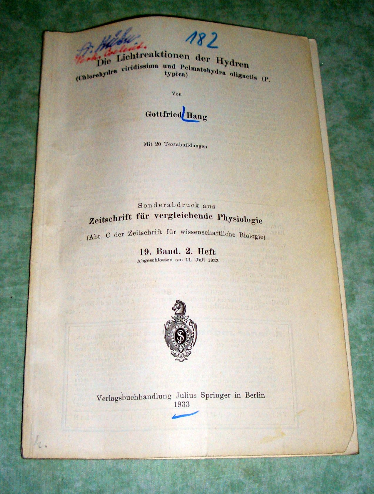 Meeresbiologie + Limnologie + Hydrobiologie Haug, Gottfried. Die Lichtreaktion der Hydren. (Chlorohydra viridissima und Pelmatohydra oligactis (P. typica) Springer. 1933. S. 247-303, 20 Textabb. Sdr.: Ztschr. f. vergleichende Physiologie 19. Bd. 2. Heft.