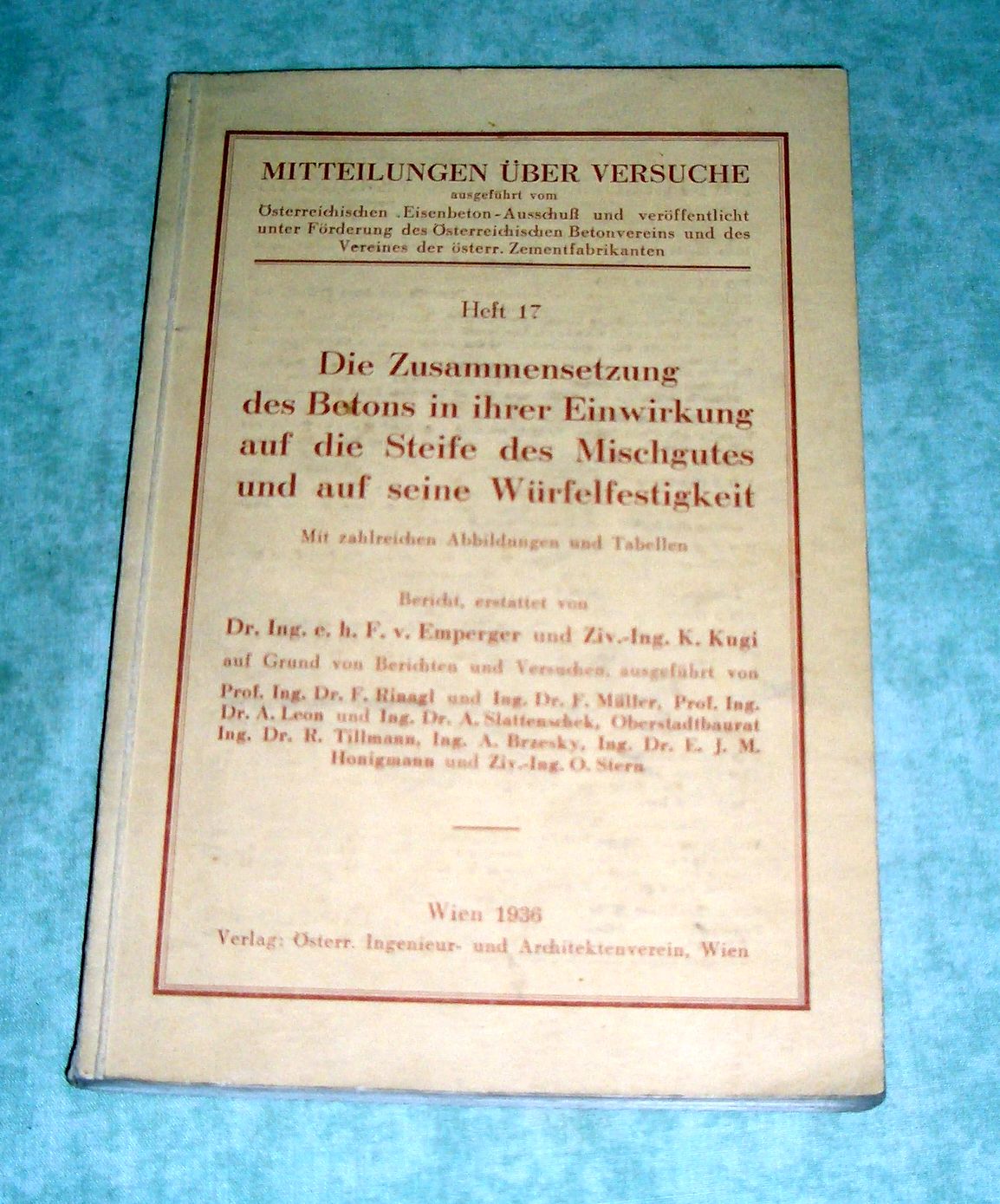 Architektur + Bauwesen Emperger, F. /Kugi, K. Die Zusammensetzung des Betons in ihrer Einwirkung auf die Steife des Mischgutes und auf seine Würfelfestigkeit. mit zahlreichen Abbildungen und Tabellen. Wien. Österr. Ingenieur- u. Architektenverein; [Berlin : Ernst in Komm.], 1936. 140 Seiten,. kart. Mitteilungen über Versuche ausgeführt vom Österreichischen Eisenbeton-Ausschuß, 17.