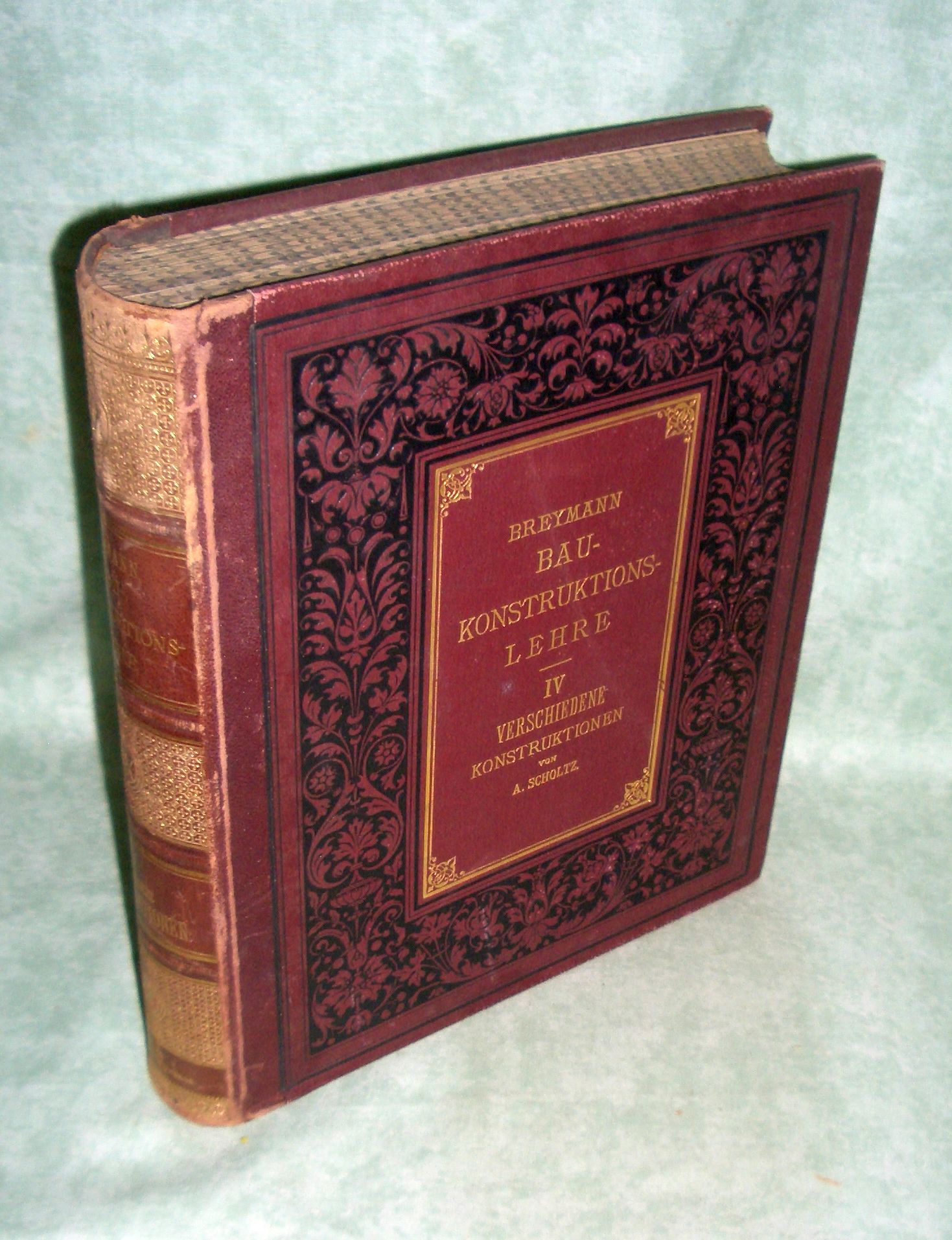 Architektur + Bauwesen Breymann, G.A. Allgemeine Baukonstruktionslehre mit besonderer Beziehung auf das Hochbauwesen. Teil IV: A. Scholtz: Verschiedene Konstruktionen, insbesondere Heizungs-, Lüftungs-, Wasserversorgungs- und Beleuchtungs-Anlagen. Haustelegraphen und Telephone. Grundbau. Miteinem Anhang: Die Bauführung. 4., gänzlich neuberarbeitete Auflage. Leipzig. Gebhardt. 1900. 24x28. XII. 507 Seiten. Anhang: 40 Seiten (Tabellen), 75 lithogr. Tafeln (32 Doppeltafeln) 837 Holzschnitillustr. Gold- und blind gepr. Originalleinen. Ecken und Kanten minimal berieben, insgesamt ein sehr gutes Ex.