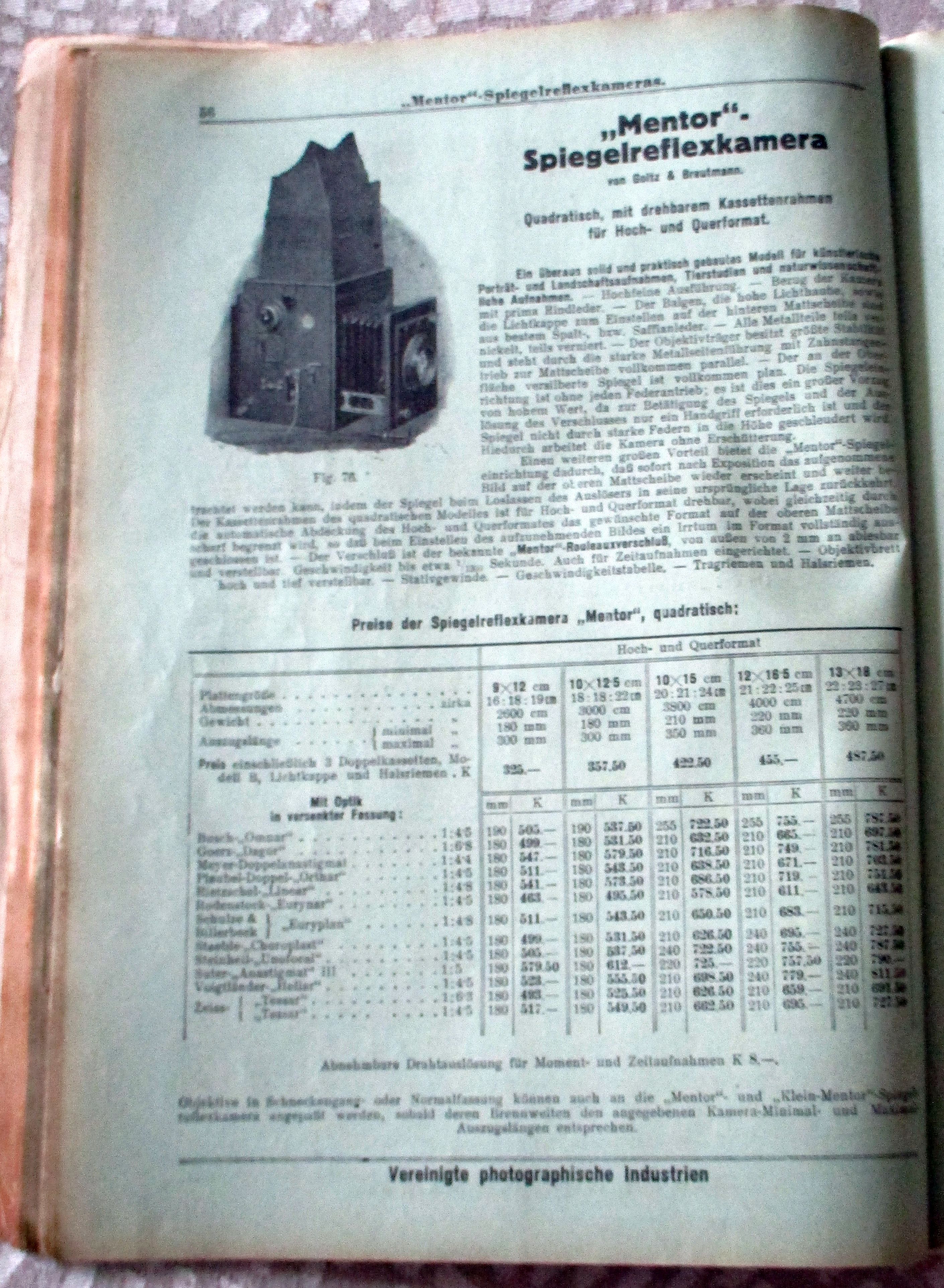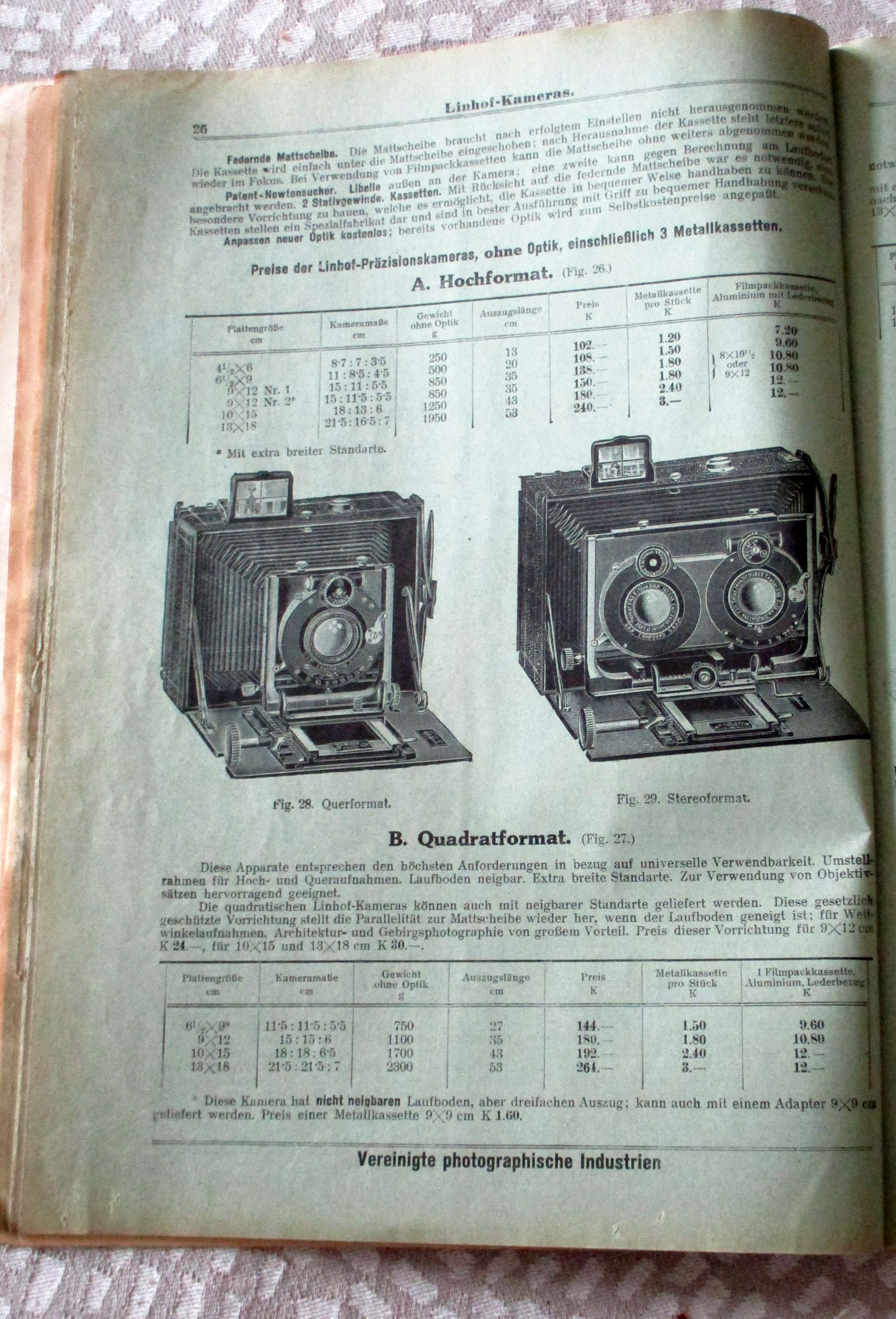 Firmengeschichte + Firmenkataloge Vereinigte Photographische Industrien. Langer & Comp. F. Hrdliczka G.m.b.H. Preisliste photographischer Bedarfsartikel und Ratgeber für deren Auswahl und Benützung, Wien. 1915. 408 Seiten, durchgehend illustriert. Einband gebrauchsspurig, innen in sehr gutem Zustand. Aus dem Inhalt: Kameras aller Art (Klappkaneras, Auszugkameras, Stereokameras, Westentaschenkameras, Spreizenkameras, Spiegelreflexkameras, Ballonkameras, Stativapparate usw.) der Marken Contessa, Ernemann, Rietzschel, Voigtländer, Goerz, Kodak, Ica, Linhof, Sonnet, Goltz und Brautmann, Nettel usw., Filme und Platten, Dunkelkammerzubehör, Dioskope und Stereobetrachtungsapparate, Kino- und Projektionsapparate usw.