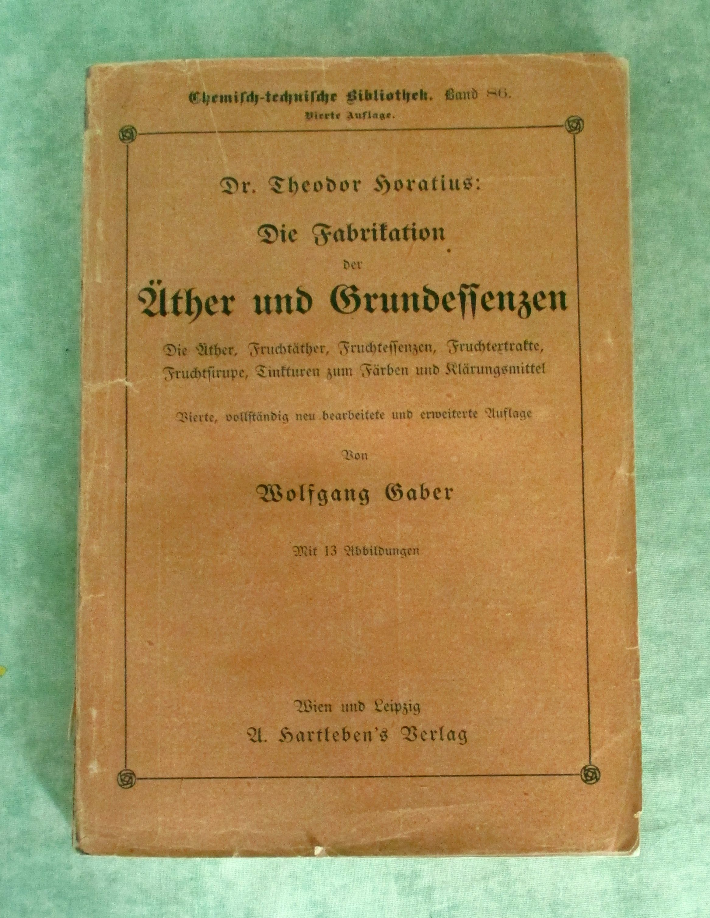 Chemische Technologie Horatius, Theodor Die Fabrikation der Äther und Grundessenzen. Die Äther, Fruchtäther, Fruchtessenzen, Fruchtextrakte, Fruchtsirupe, Tinkturen zum Färben und Klärungsmittel. 4. vollständig neu bearb. und erw. Auflage von Wolfgang Gaber. Wien. Hartleben. 1929. 291 Seiten, 13 Abb. Broschur. In altersgemäßem guten Zustand. Chemisch-technische Bibliothek 86. Band.