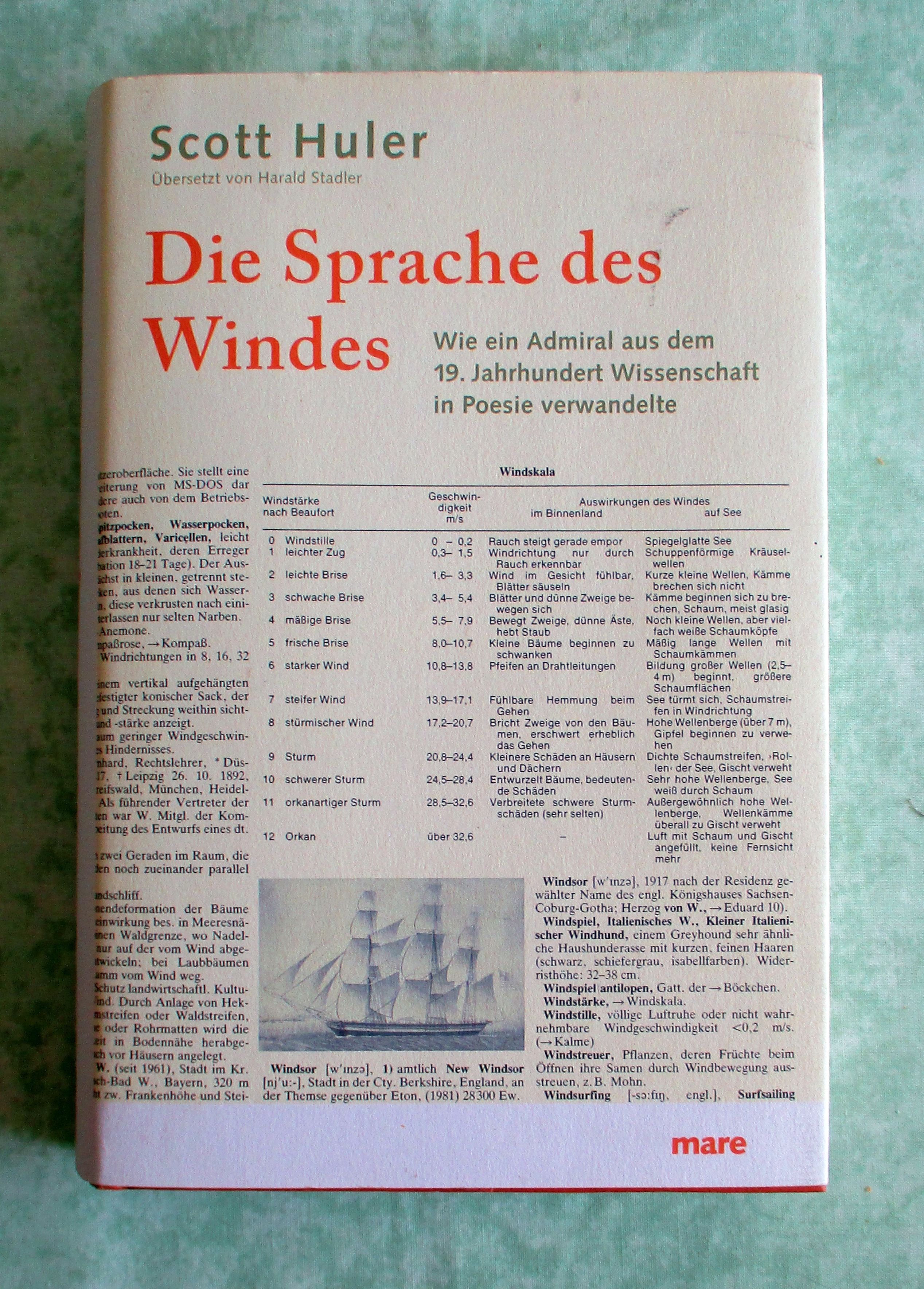 Marinegeschichte – Schiffe + Schifffahrt Huler, Scott. Die Sprache des Windes. Wie ein Admiral aus dem 19. Jahrhundert Wissenschaft in Poesie verwandelte. Hamburg. Mare. 2009. 22 cm Beil. ([1] Bl.). 318 Seiten, Ill., graph. Darst., Kt. Pappband mit Schutzumschlag.