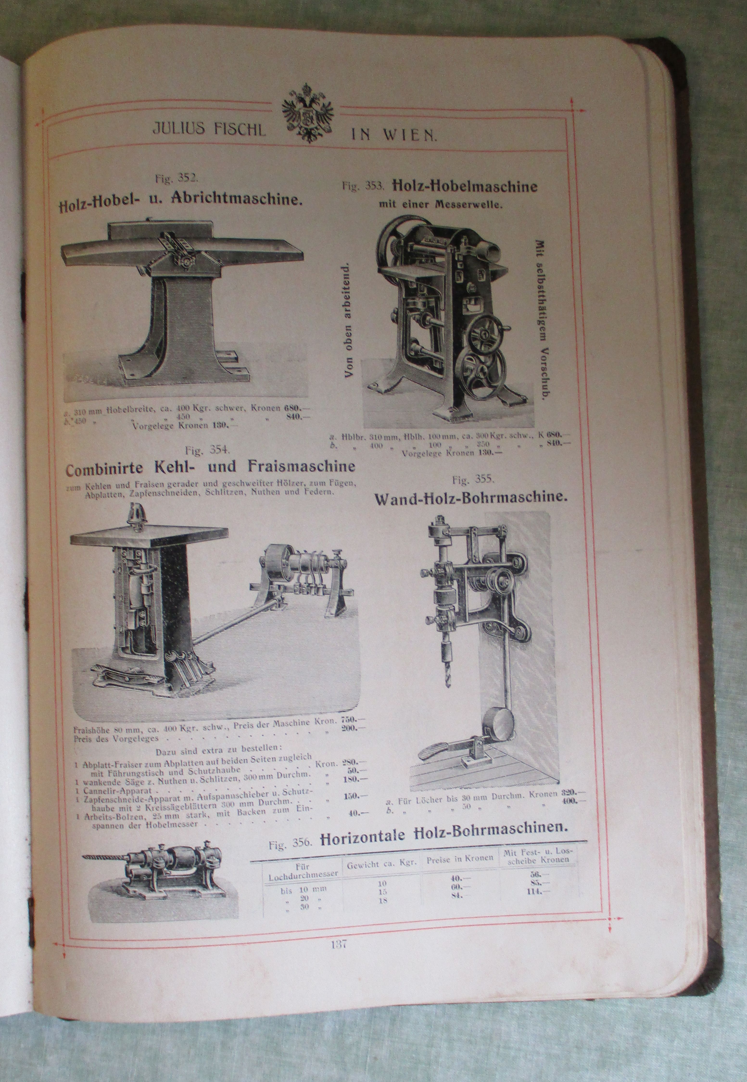 Firmengeschichte + Firmenkataloge Julius Fischl – Wien II/², Lichtenauergasse 1 – Grosshandlung in Maschinen, Techn. Bedarfsartikel für alle Industrien und Eisenbahnen. – Treibriemen-Manufactur. Neuer Illustrirter Catalog. Wien. 1902. 200 Seiten, durchgehend illustriert. Hardcover. Ecken bestossen und leicht staubfleckig. Innen einwandfrei. Maschinen, Ventile, Schmieraparate, Werkzeuge aller Art, Drehbänke, Waagen, Pumpen, Feuerspritzen, Bleche, Motore, Lampen usw.