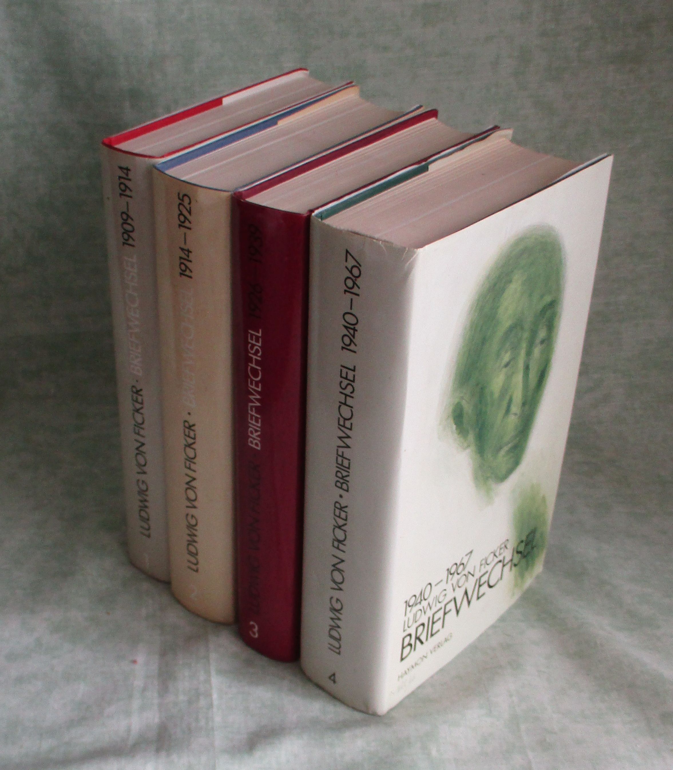 Österr. Musik-, Literatur- und Theatergeschichte Ficker, Ludwig von. Briefwechsel. 1: 1909-1914, 2: 1914-1925, 3: 1926-1939, 4: 1940-1967. Hrsg. von Ignaz Zangerle, Walter Methlagl, Franz Seyr, Anton Unterkircher 4 Bände. . Otto Müller Vlg. – Haymon Vlg. 1986 – 1997. 420, 590. 462.647 Seiten. Leinen mit Schutzumschlag. Brenner Studien Bd.VI, VIII, XI, XV.