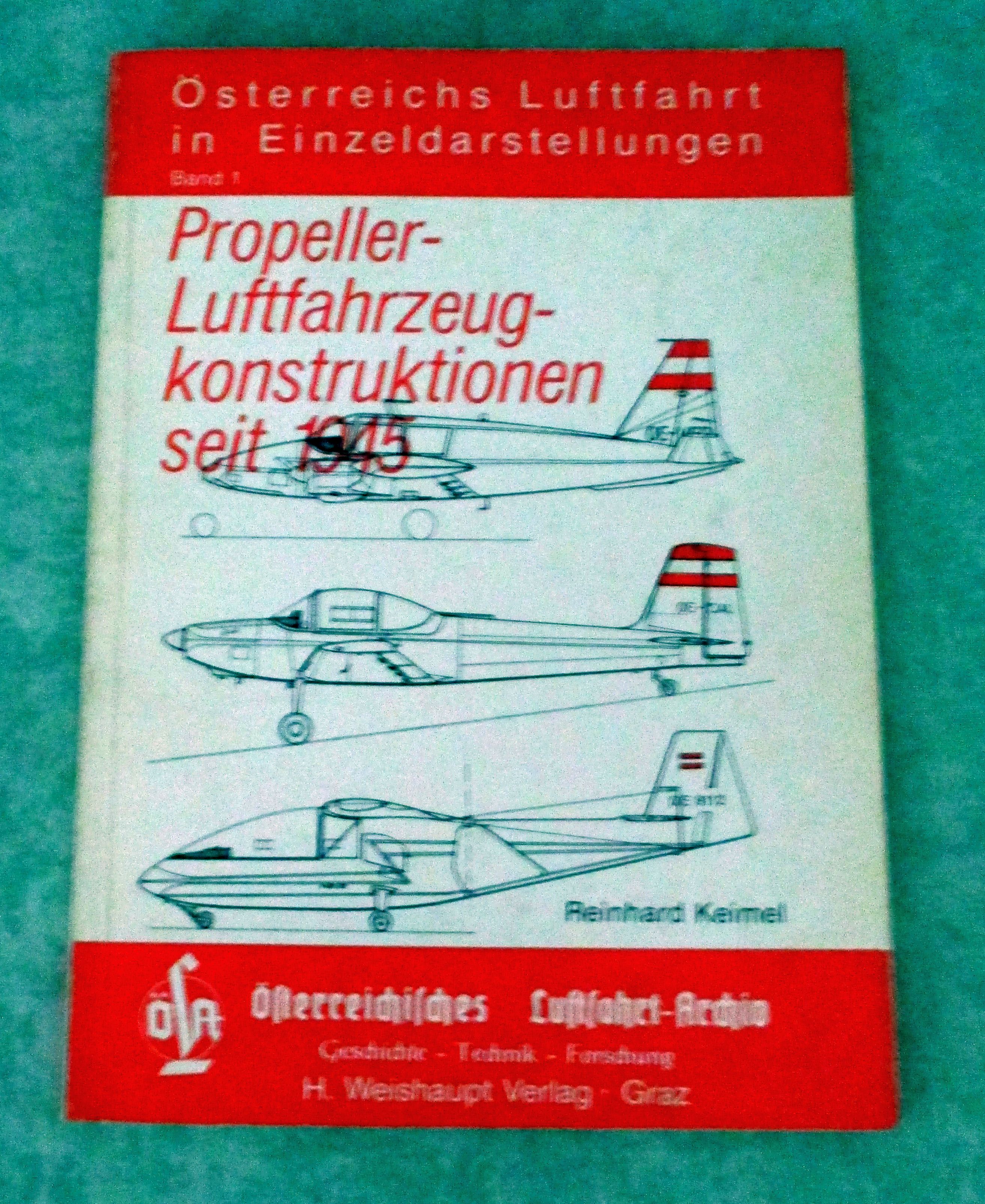 Luft- + Raumfahrt Keimel, R. Propeller-Luftfahrzeugkonstruktionen seit 1945. 1. Aufl. Weishaupt. Graz. 1980. 14,5x21. 72 S. Reichlich illustr. Kart. Einband leicht berieben.D 1224 Österreichs Luftfahrt in Einzeldarstellungen, Bd. 1