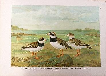 Vögel – Grafik Keulemans, J.G. Sand-Regenpfeifer. Charadrius hiaticula L. Farblithographie aus Naumann, J.A. Naturgeschichte der Vögel. 1897-1905. 40 x 28,8 cm. 1 Männchen im Sommerkleide. 2 Weibchen im Sommerkleide. 3 Jugendkleid.