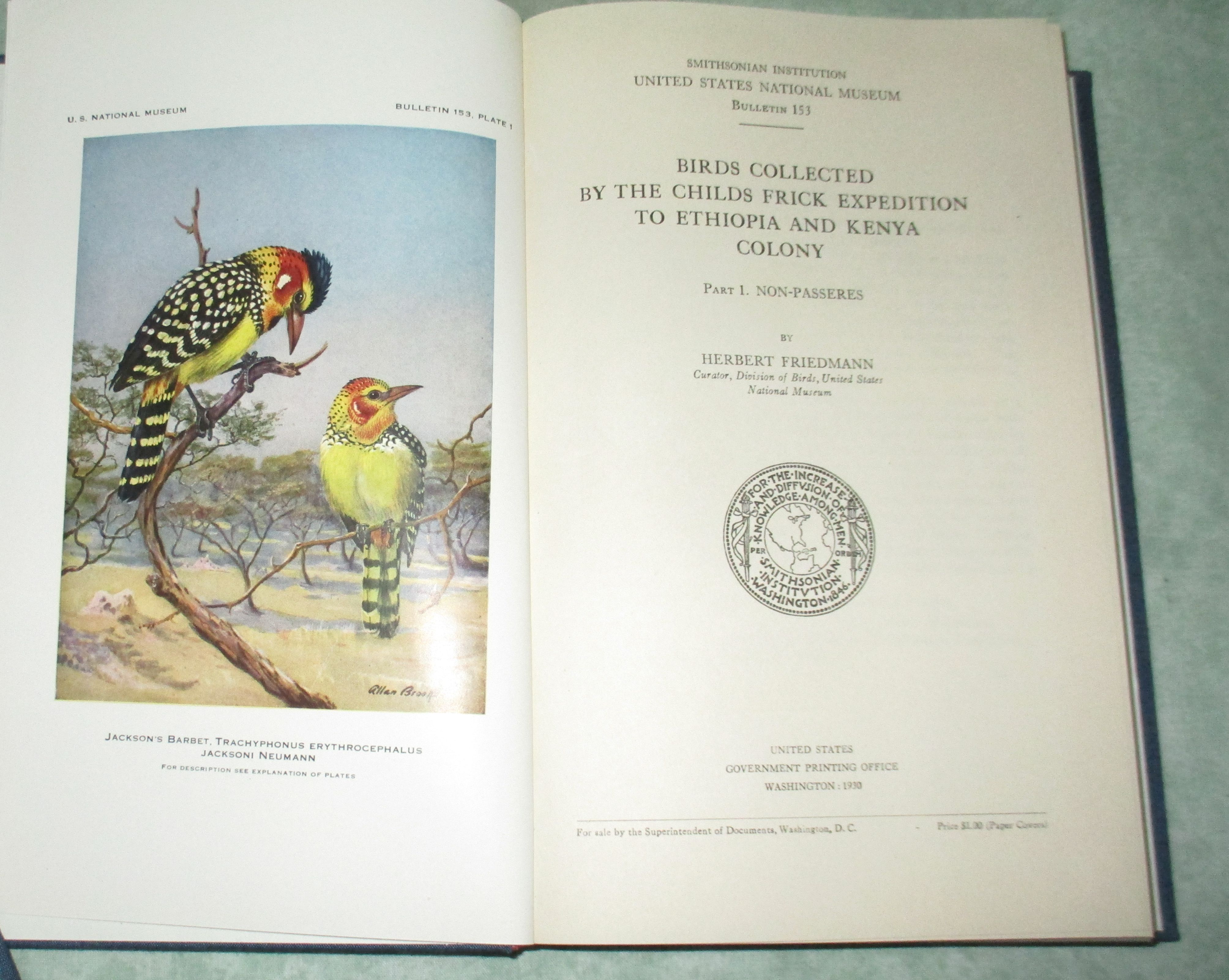 Ornithologie – Vogelkunde Friedmann, Herbert. Birds collected by the Childs Frick Expedition to Ethiopia and Kenya Colony. Part. 1. Non-Passeres. Part 2. Passeres. Washington. 1937. XIII. 516. XII. 506 p., 26 (2 col.) plates. Cloth. Good samples. Smithsonian Institution U.S. National Museum Bulletin 153.