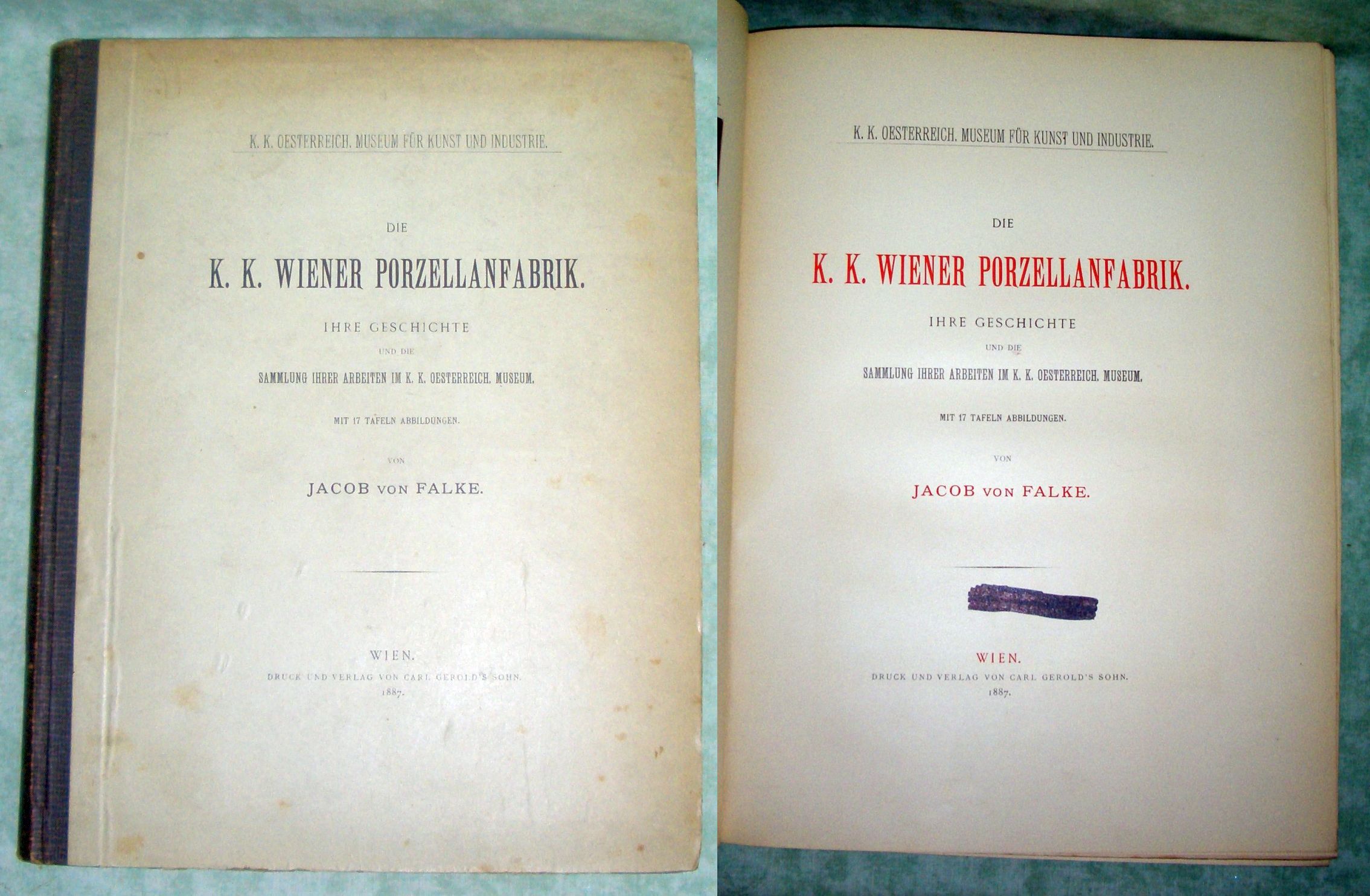 Kunsthandwerk + Kunstgewerbe Falke, Jacob von. Die k.k. Wiener Porzellanfabrik. Ihre Geschichte und die Sammlung ihrer Arbeiten im k.k. Österreichischen Museum Wien. Carl Gerold’s Söhne. 1887. -4°. 90 Seiten, 17 Tafeln, davon 1 in Farbe. Originalhalbleinen. Kanten bestossen, Stempel am Titel übermalt. Gesamtgesehen gutes Ex.!