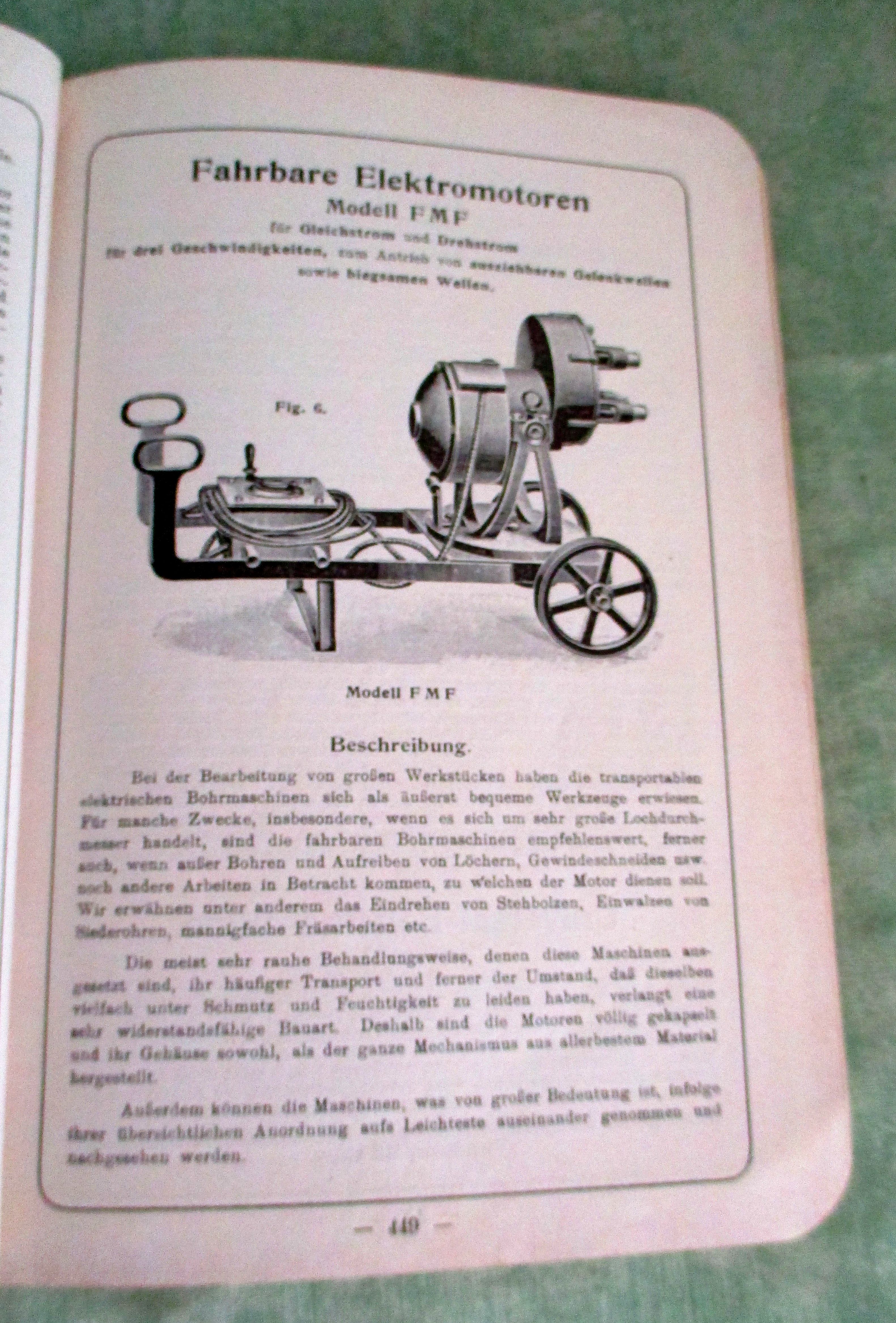 Firmengeschichte + Firmenkataloge M. Selig junior & Co. Inhaber: Martin Wigdor & Louis Wolfermann. Berlin N.W. Karl-Strasse 20 Elektrisch betriebene Werkzeuge – Apparate – Maschinen. Ausgabe IX. Um 1905. 11 x 15. 144 Seiten, durchgehend illustriert. Kart. Einband leicht staubfleckig, innen einwandfrei! Kleiner, umfangreicher Katalog mit einem äußerst umfassendem Angebot an aller Art von elektrischen Bohrmaschinen, fahrbaren Elektromotoren, biegsamen Arbeitswellen, Schleif- und Poliermaschinen, Hochdruck-Ventilatoren, Elektro-magnetische Aufspann-Apparate, Elektro-Magnet-Greifer und Spannstöcke, Entmagnetisier-Apparate.