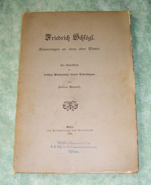 Wien – Landeskunde Newald, Julius. Schlögel, Friedrich. Erinnerungen an einen alten Wiener. Ein Gedenkblatt zur dritten Wiederkehr seines Todestages Wien. Im Selbsverlage d. Verfassers. 1895. 43 Seiten. Interimsbrosch. Friedrich Schlögl (1821-1892) wurde in der damaligen Wiener Vorortgemeinde Laimgrube im Haus Zum Auerhahn (heutiger Standort Gumpendorfer Straße 48), das nicht mehr besteht, als Sohn eines Hutmachergesellen geboren