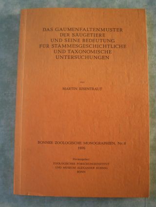 Zoologie Eisentraut, Martin. Das Gaumenfaltenmuster der Säugetiere und seine Bedeutung für stammesgeschichtliche und taxonomische Untersuchungen. Bonn. Zoolog. Forschungsinst. u. Museum Alexander Koenig, 1976. 24 cm. 214 Seiten, 159 Ill. u. graph. Darst. Kart. Bonner zoologische Monographien ; Nr. 8.