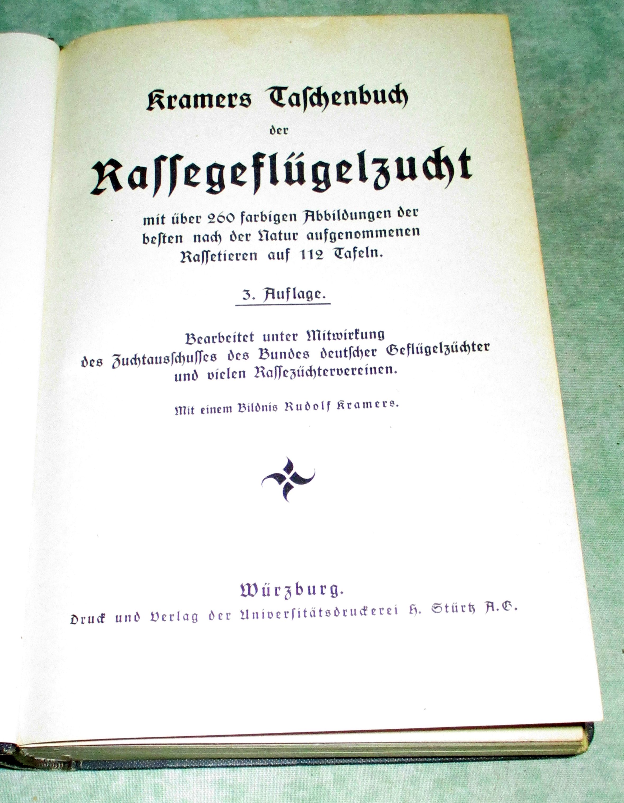 Stubenvögel-, Geflügel-, und Taubenliteratur Kramers Taschenbuch der Rassegeflügelzucht. Mit über 260 farbigen Abbildungen der besten nach der besten nach der Natur aufgenommenen Rassetieren auf 112 Tafeln. Würzburg. Vlg. d. Universitätsdruckerei H. Stürtz. 1926. 14 Seiten (Text). 112 chromlithogr. Tafeln. Originalleinen mit gepr. Titel. Einband minimal berieben, ansonsten ein ausnehmend gutes Ex. des gesuchten Werkes. Aus dem Besitz der Familie Hagenbeck: Mit einer Widmung von Lorenz Hagenbeck für seinen Enkel Diedrich Thomas Hagenbeck. Lorenz Hagenbeck war der zweitälteste Sohn von Carl Hagenbeck. Carl Hagenbeck war ein deutscher Tierhändler, Völkerschauausrichter und Zoodirektor. Er revolutionierte und beeinflusste weltweit die Zooarchitektur durch die Erfindung naturalistischer Freigehege. Er war auch Begründer von „Hagenbecks Zoologischem Circus“. Lorenz Hagenbeck führte in der Nachfolge seines Vaters die Geschäfte weiter, er gründete einen neuen Zirkus mit dem er in vielen Ländern der Welt gastierte.