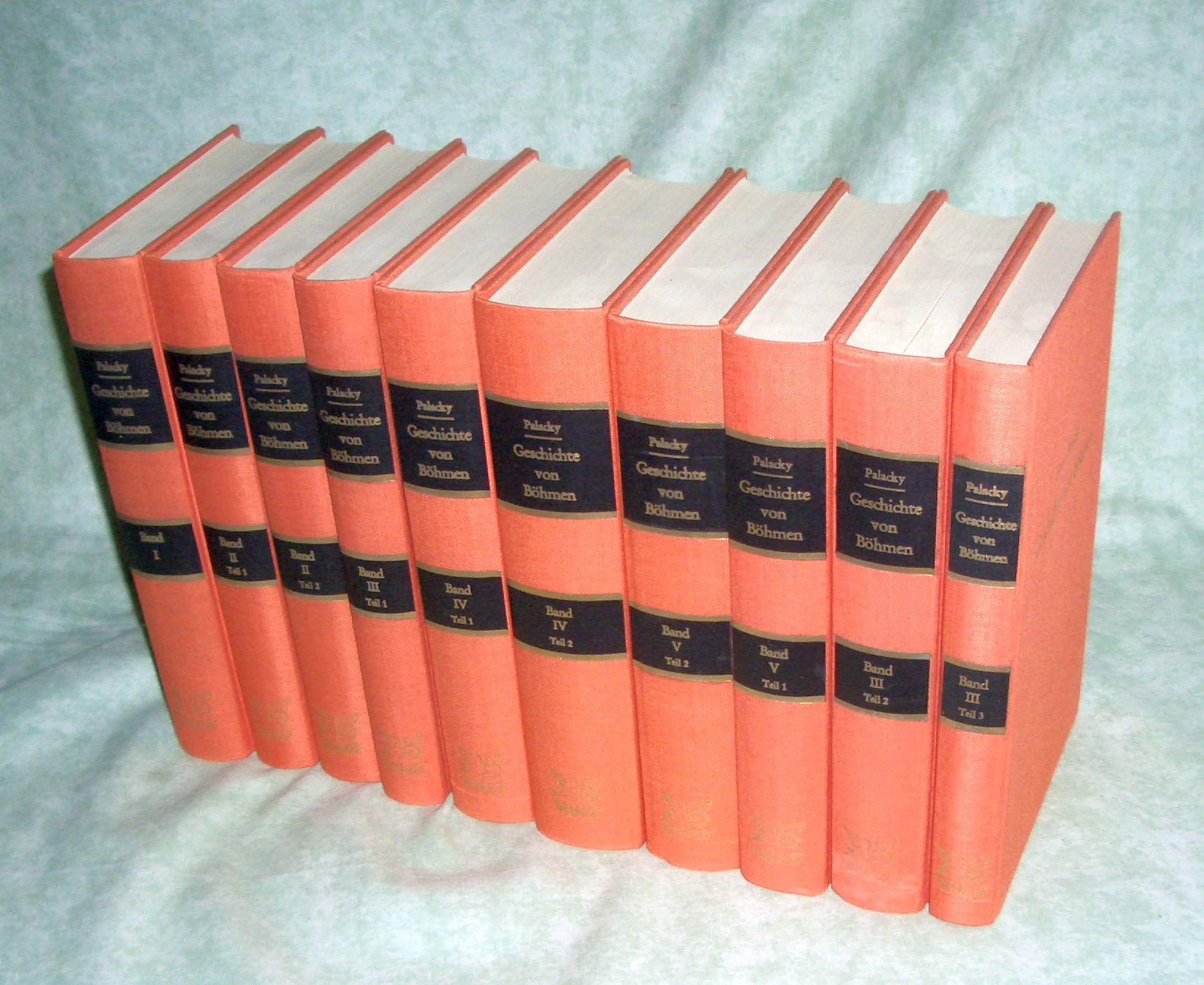 Geschichte + Zeitgeschichte Palacký, Franz. Geschichte von Böhmen. Größtentheils nach Urkunden und Handschriften. Erster Band. Die Urgeschichte und die Zeit der Herzoge in Böhmen bis zum Jahre 1197. Band II/Teil 1: Böhmen als erbliches Königreich unter den Premysliden. Vom Jahre 1197 bis 1306. Teil 2: Böhmen unter dem Hause Luxenburg, bis zum Tode Kaiser Karls IV: Jahre 1306 bis 1378.Band III/1: Böhmen unter König Wenzel IV, bis zum Ausbruch des Hussitenkrieges. Vom Jahre 1378-1419. Teil 2: Der Hussitenkrieg von 1419-1431. Teil 3: Böhmen und das Baseler Concil. Sigmund und Albrecht. J. 1431-1439.Band IV/1: Das Zeitalter Georgs von Podèbrad. Erste Abtheilung. Die Zeit von 1439 bis zu K. Ladislaws Tode 1457. 2. Teil: Das Zeitalter Georgs von Podèbrad. Zweite Abtheilung. K. Georgs Regierung 1457-1471. Band V/1: Das Zeitalter der Jagelloniden. Erste Abtheilung. K. Wladislaw II von 1471 bis 1500. Neudruck der Ausgabe 1844 – 1867. 5 Bände in 10 gebunden. Osnabrück, Otto Zeller. 1968. Leinen. In sehr gutem Zustand!