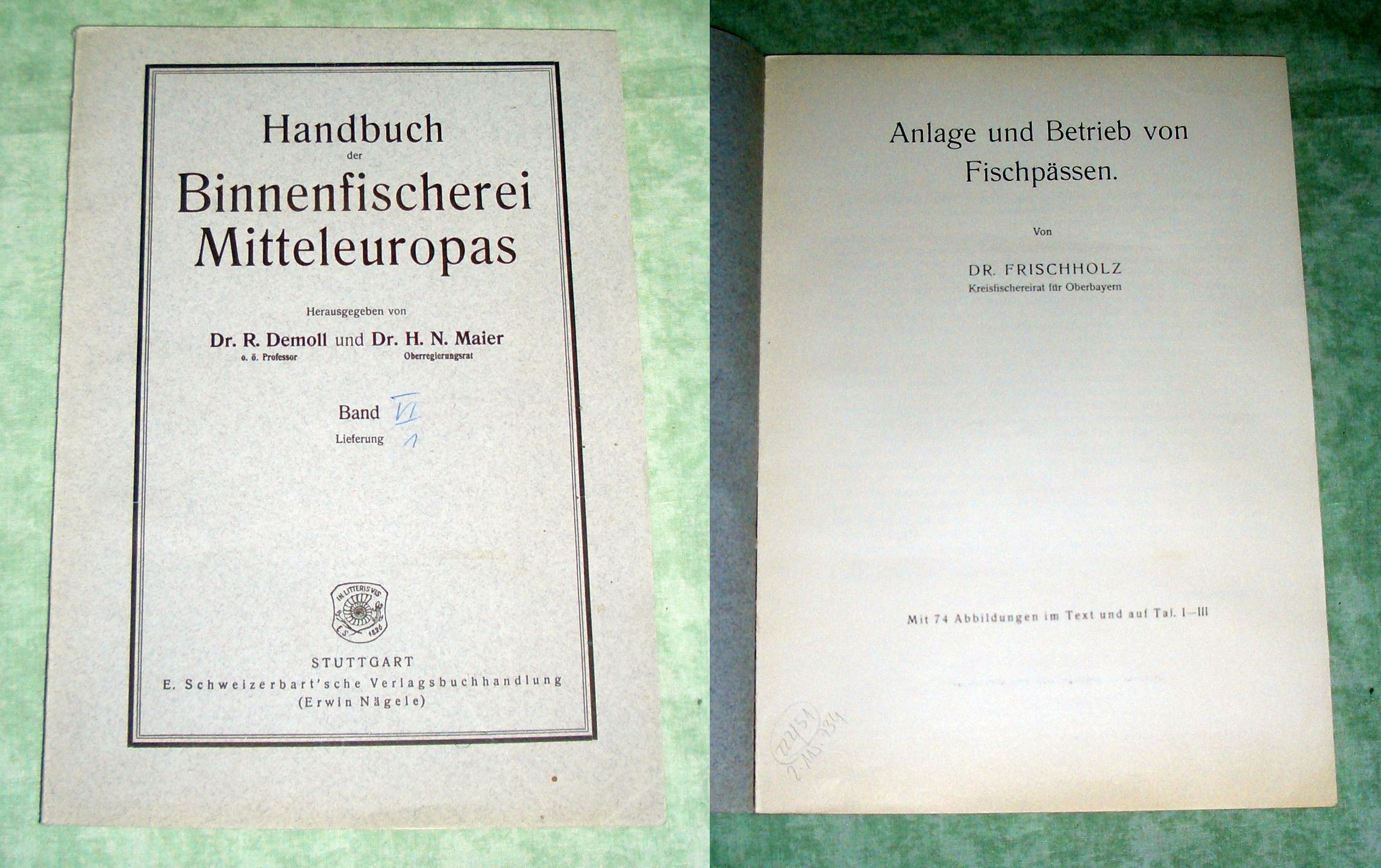 Angeln, Fischerei, Fischzucht Frischholz. Anlage und Betrieb von Fischpässen. Stuttgart. Schweizerbart. 1923. 137 Seiten, 74 Abb. im Text und auf Taf. I-III. kart. Handbuch der Binnenfischerei Mitteleuropas, Bd.VI, Lieferung 1.