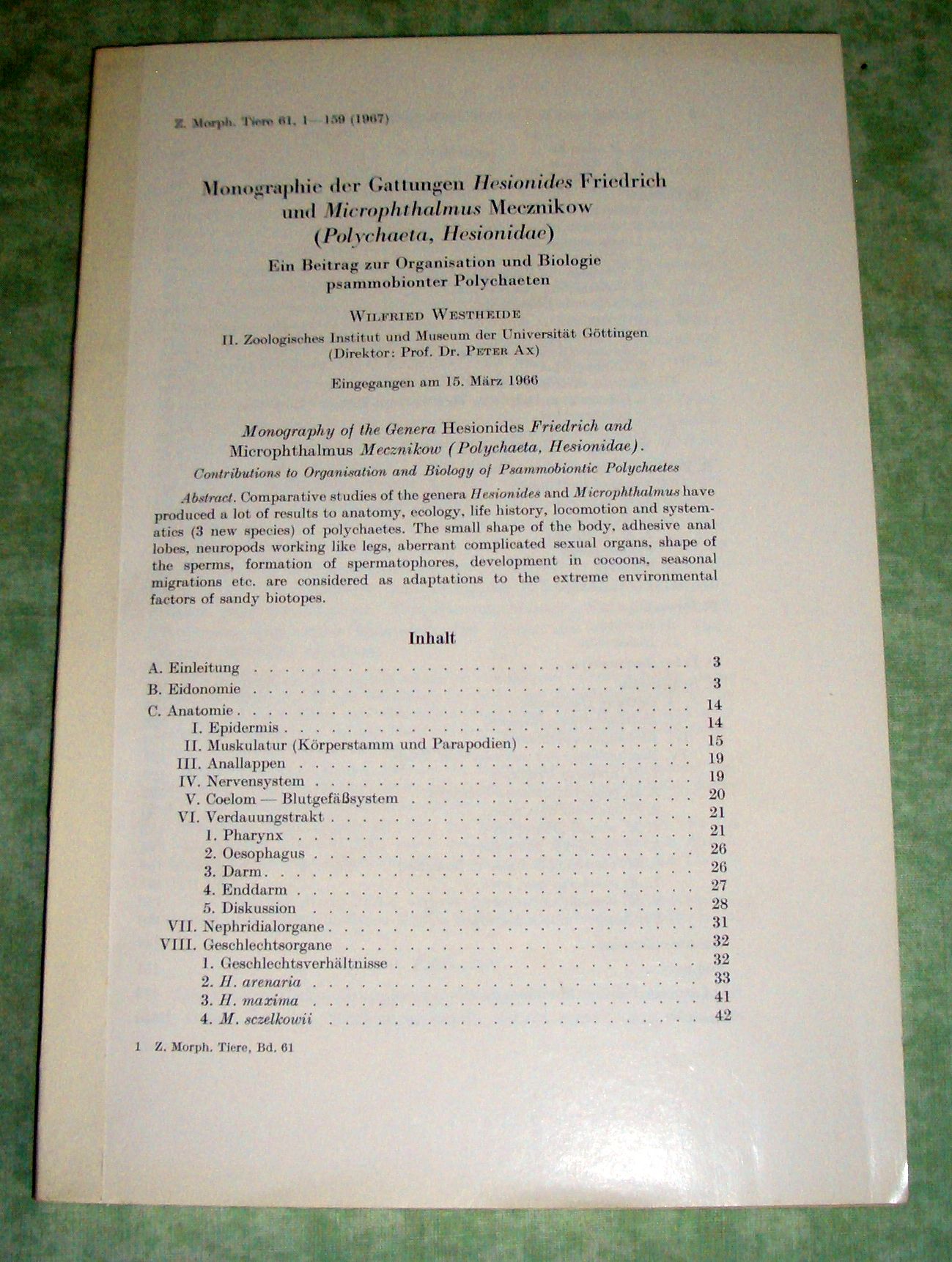 Zoologie Westheide, Wilfried. Monographie der Gattungen Hesionides Friedrich und Microphtalmus Mecnikow (Polychaeta, Hesionidae). Ein Beitrag zur Organisation und Biologie psammobionter Polychaeten. 159 Seiten, 76 Abb. Sdr. Morph. Tiere Bd. 61.