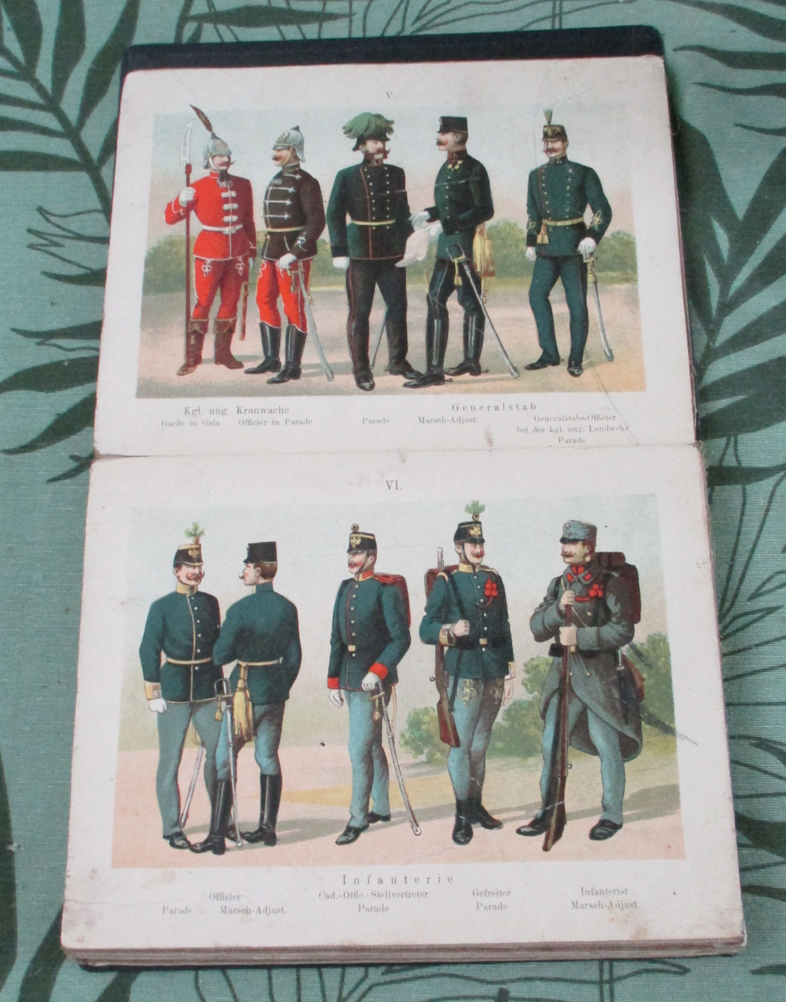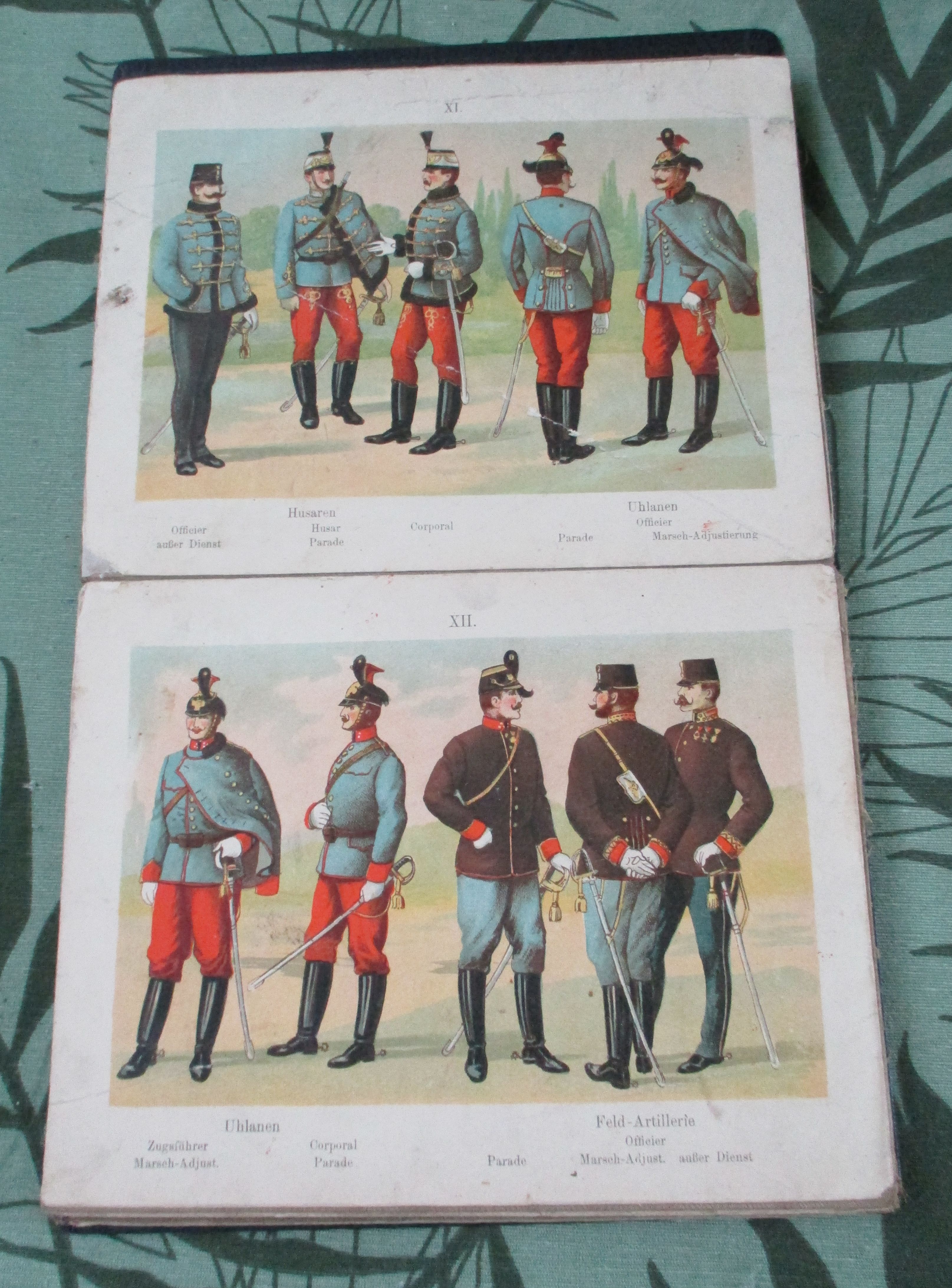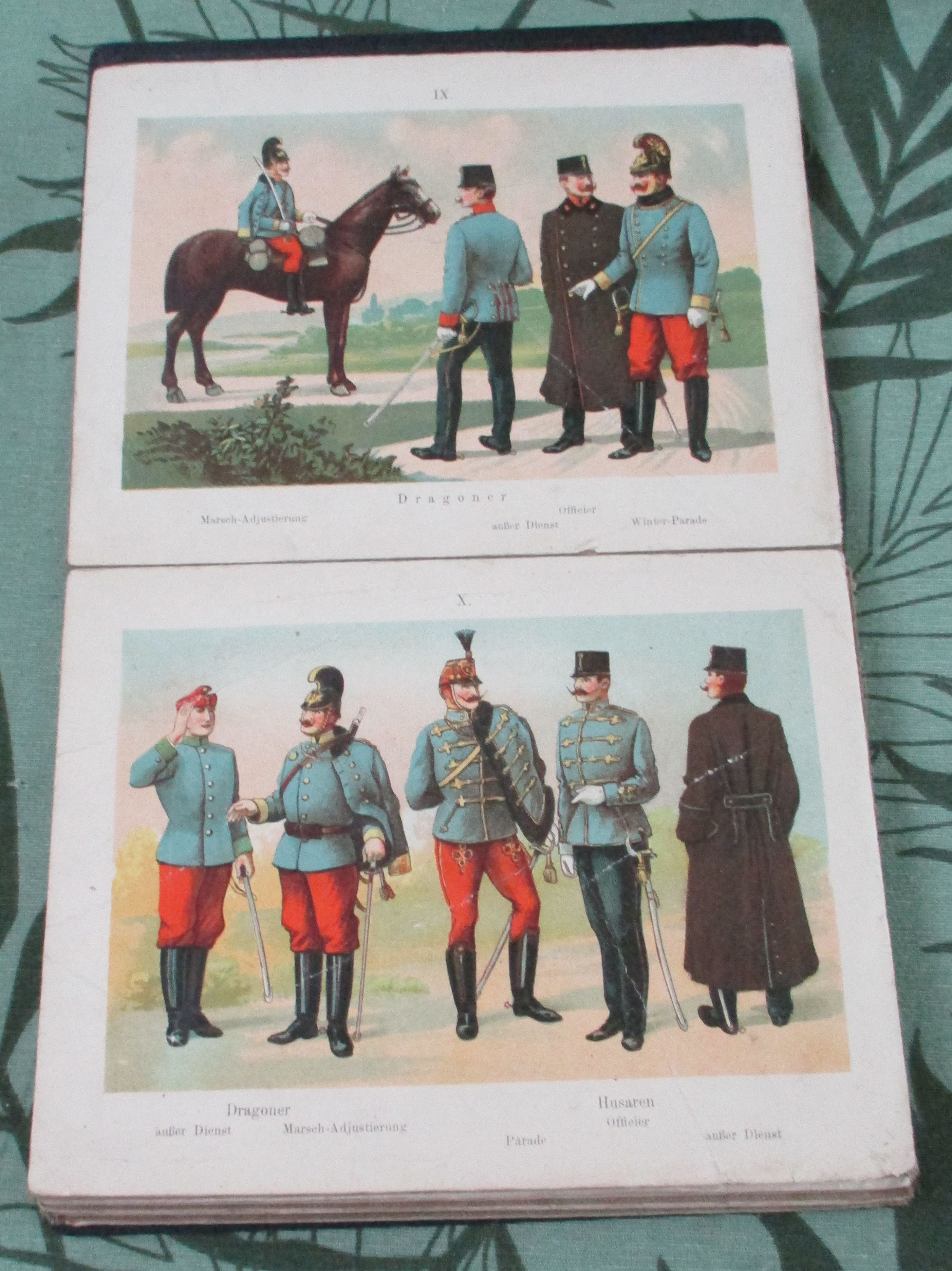 Österr. Heeres- + Marinegeschichte Die k.u.K. oesterreichisch-ungarische Armee. Bildlich dargestellt nach den neuesten Adjustierungsvorschriften. Nach Original-Skizzen von E. R. Barteau. Wien. Seidel & Sohn. 1893. 15,5 x 19,5 cm. Leporello mit 24 farblithogr. Tafeln (23 Tafeln Adjustierungen mit ca. 120 Uniformen , 1 Tafel mit Uniformzeichen). Restauriertes Ex. Tafeln z. Tl. mit Knickfalten und leicht fleckig, insgesamt jedoch durch die Restaurierung in einen passablen Zustand versetzt.