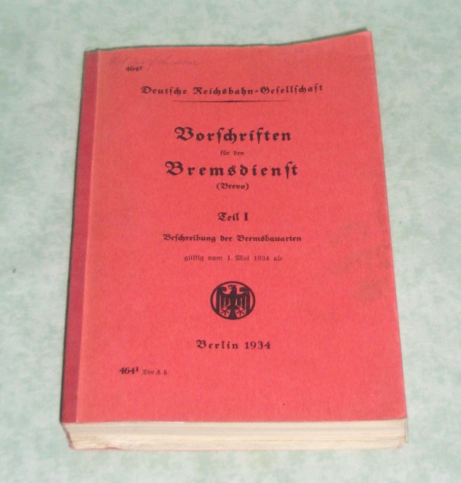 Eisenbahn Deutsche Reichsbahn-Gesellschaft. Vorschriften für den Bremsdienst. Teil I: Beschreibung der Bremsbauarten. Gültig vom 1. Mai 1934 an. Berlin. 1934. 294 Seiten Text mit 128 Textabb., mit 30 ausfaltbaren Tafeln. kart. Dienstvorschriften / Deutsche Reichsbahn.