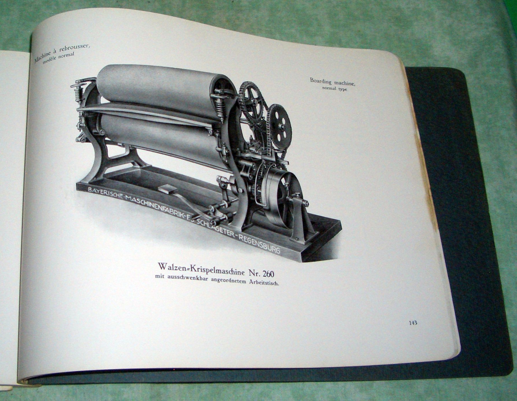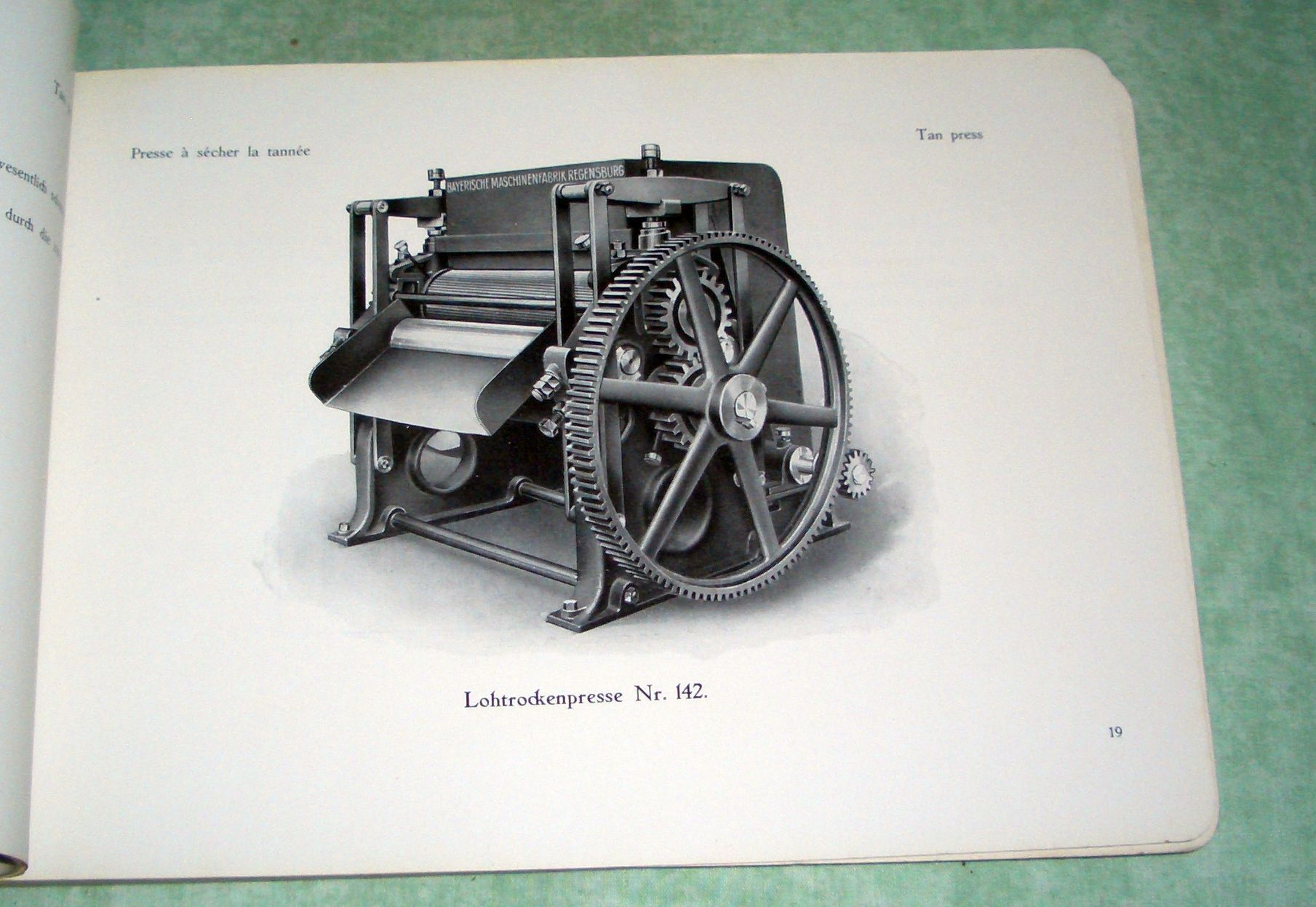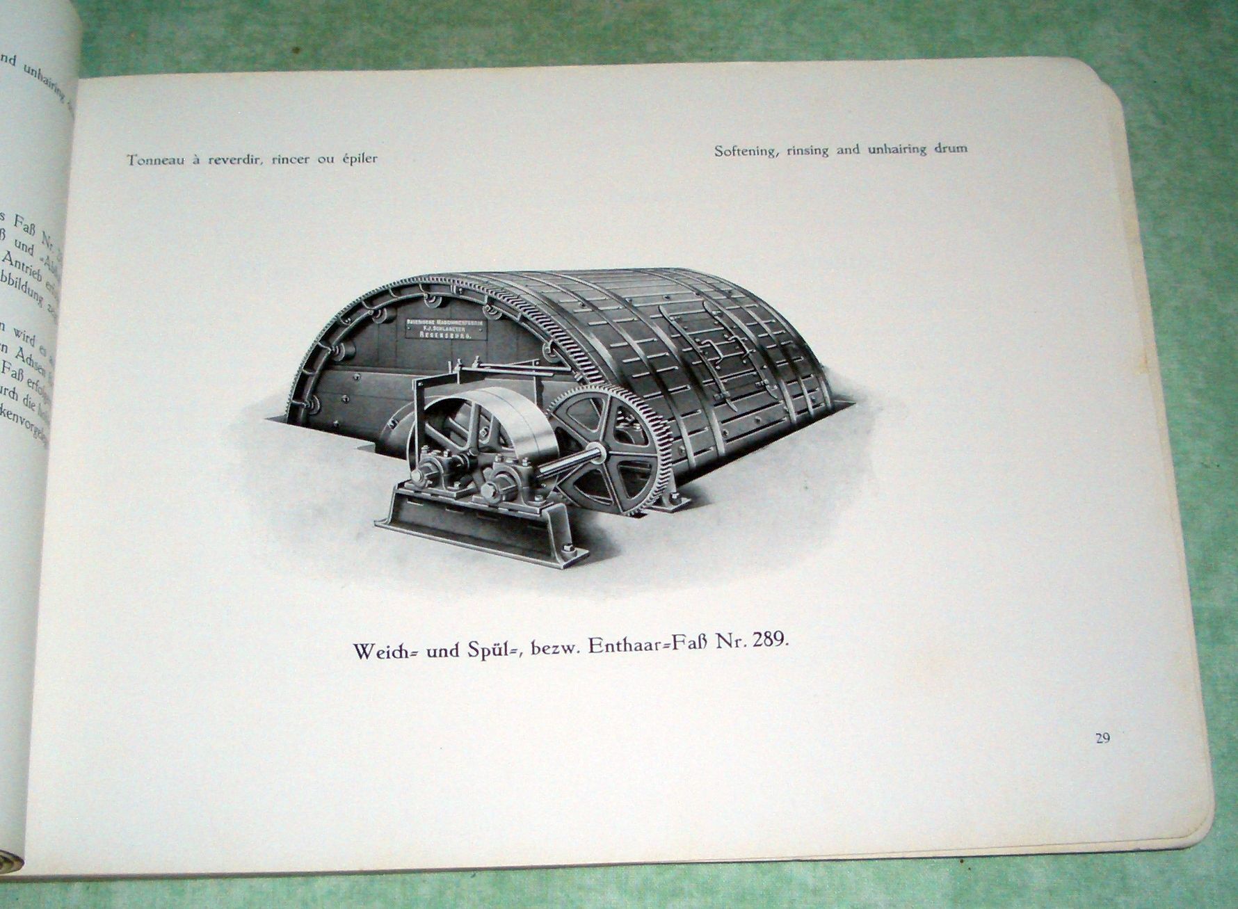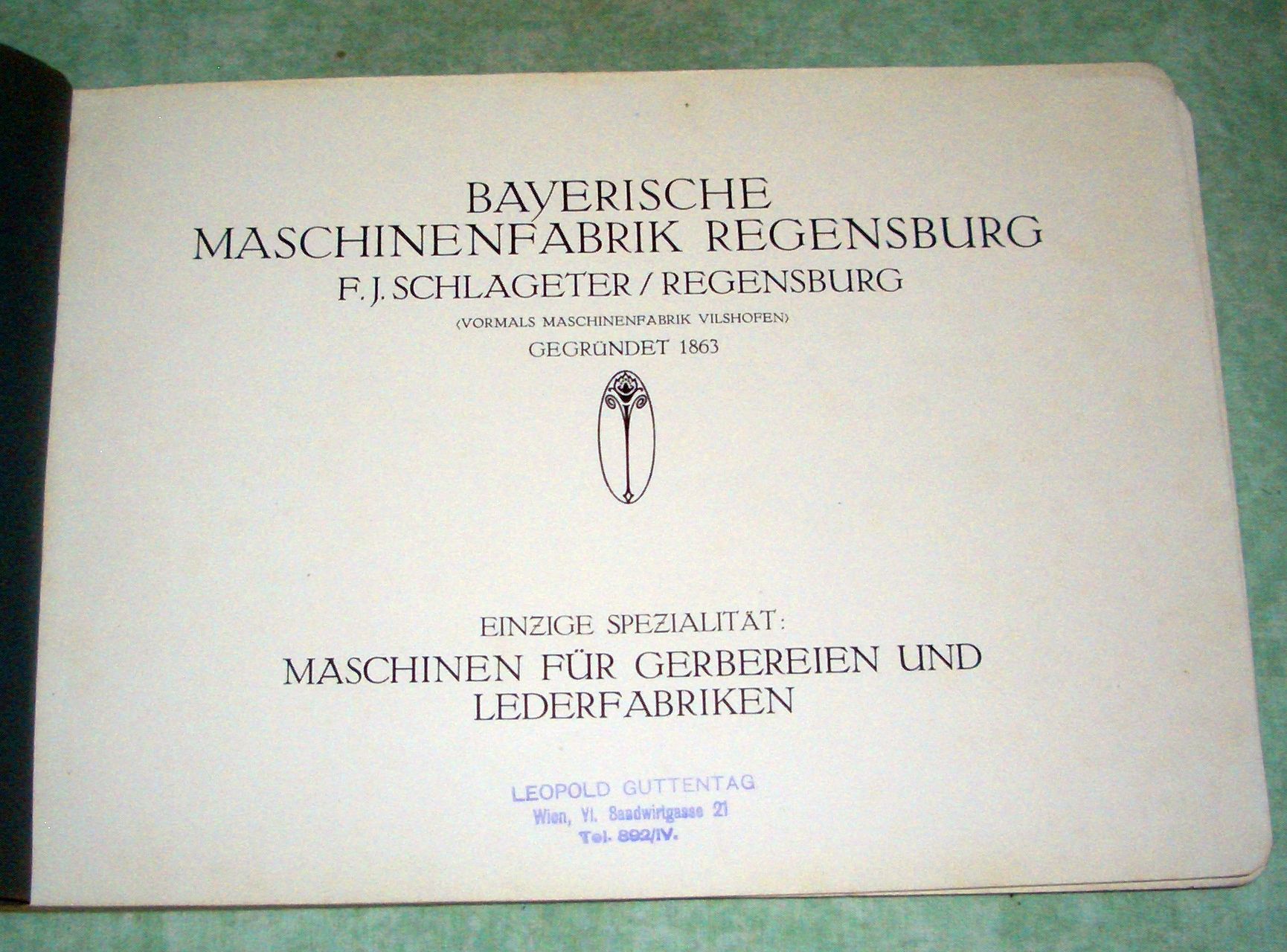 Firmengeschichte + Firmenkataloge Bayerische Maschinenfabrik Regensburg F.J. Schlageter/Regensburg. Maschinen für Gerbereien und Lederfabriken. Um 1925. 167 Seiten, durchgehend illustriert. (u.a. Werksansicht) Kordelbindung. Schnitt leicht fleckig, ansonsten in ausgezeichnetem Zustand! Beilage: Grossgerbfass „Bavaria“.