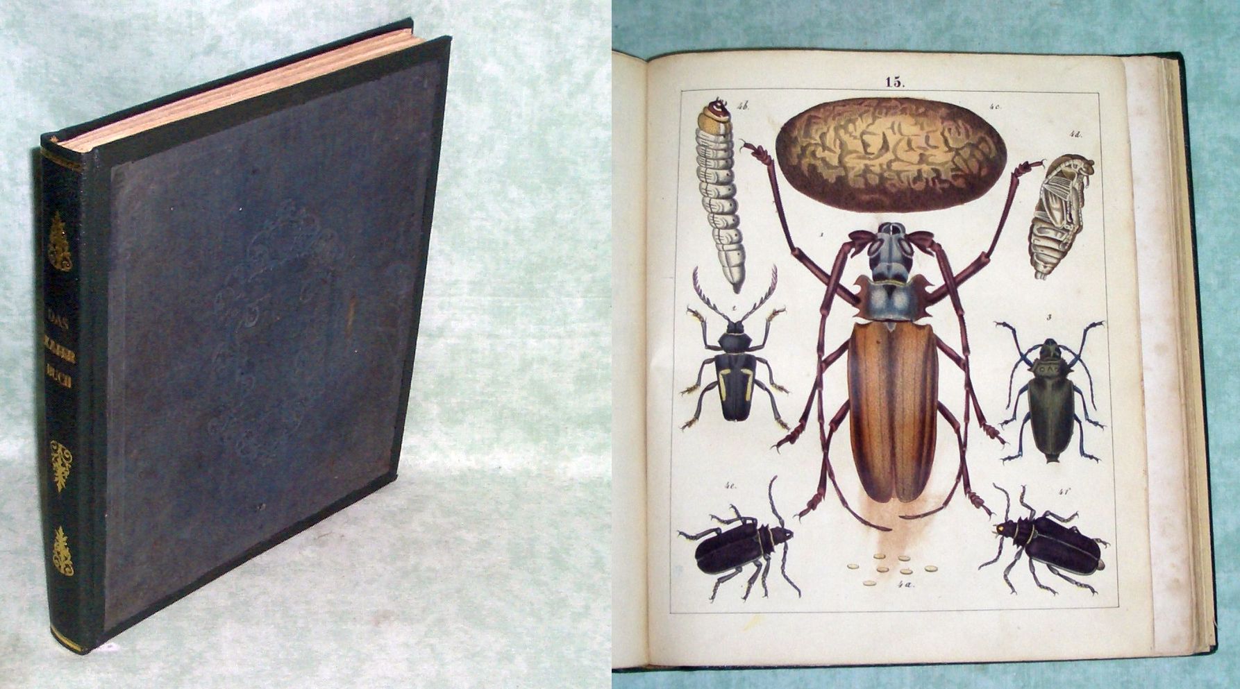 Coleoptera – Käfer Berge, Friedrich: Käferbuch. Allgemeine und specielle Naturgeschichte der Käfer ; mit vorzüglicher Rücksicht auf die europäischen Gattungen ; nebst der Anweisung, sie zu sammeln, zuzubereiten und aufzubewahren. Stuttgart. Hoffmann. 1844. 268 Seiten, 1315 handkolorierten Abbildungen auf 36 Tafeln. Professionell restauriertes Ex. Halbleder mit goldgepr. Rücken. Die ursprünglich mit dem Vorwort verklebte Titelseite wurde professionell restauriert. Dadurch fehlen beim Vorwort im Randbereich einige Buchstaben, die aber das sinnerfassende Lesen kaum behindern. Ansonsten in gutem, sauberem Zustand, die Tafeln mit kräftigem Kolorit.