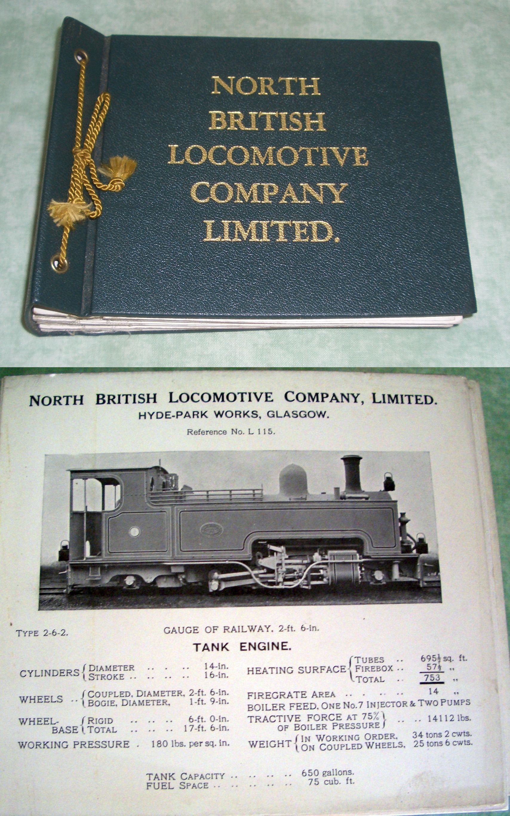 Eisenbahn North British Locomotive Company Limited. 36 Karten mit Dampflokomotiven, jeweils mit Foto und technischen Angaben. Enthalten sind folgende Modelle: L3, L101, L102, L105, L111, L118, L 120, L121, L 122, L 124, L 126, L 127, L 134, L 135, L 138, L 144, L 145, L 146, L 148, L 150, L 151, L160, L 161, L 163, L 165, L 172, L 176, L 209, L 313, L 372, L 385, L 457, L 499. Glasgow. Um 1920? Dekoratives, goldgepr. Album mit Kordelbindung und umlaufendem Goldschnitt. Insgesamt in gutem Zustand.
