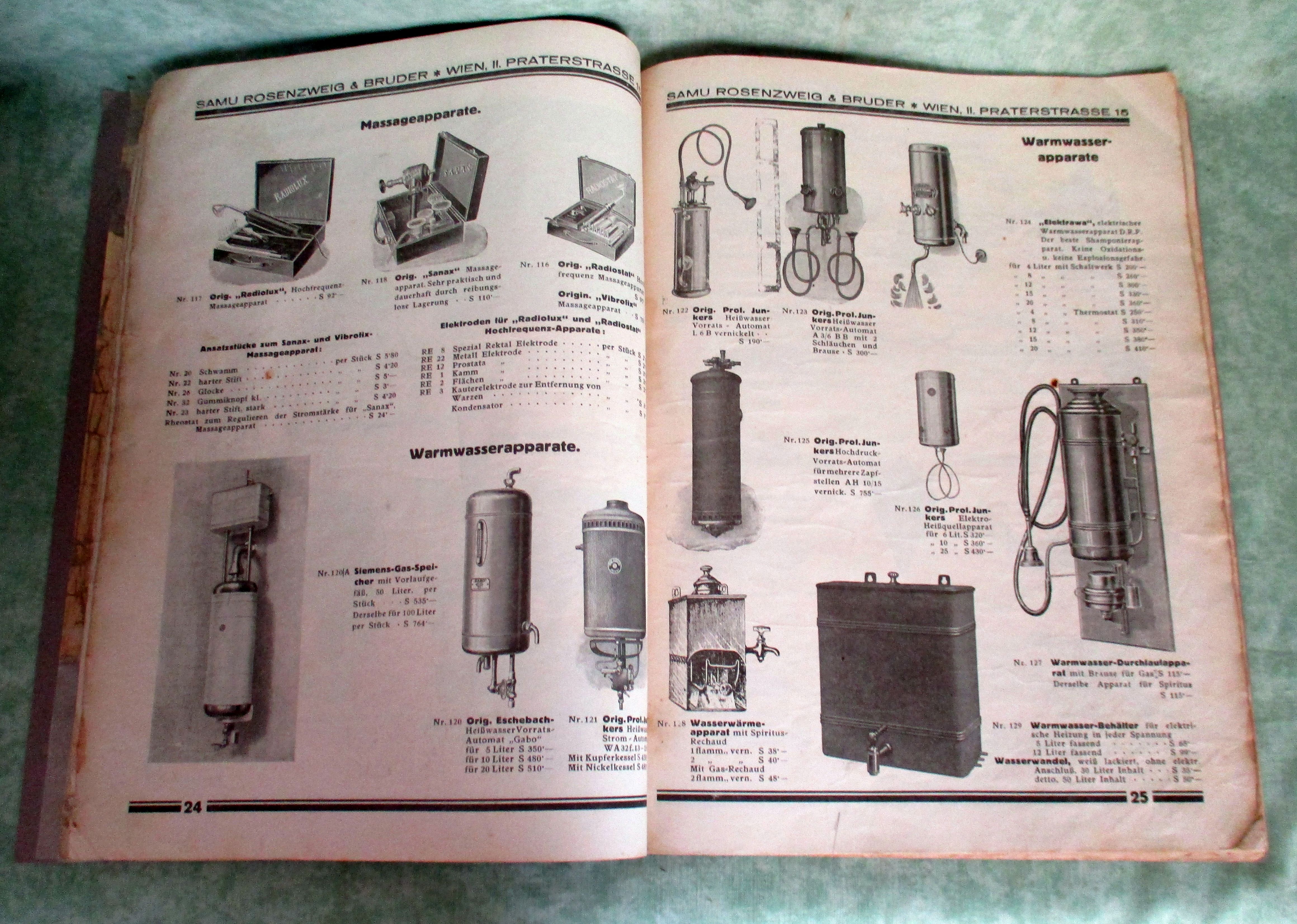 Firmengeschichte + Firmenkataloge Samu Rosenzweig & Bruder. Wien II. Bezirk, Praterstrasse Nr. 15 (Lloydhof). Grösstes Etablissment für moderne Herren- und Damen- Frisiersalon Einrichtungen. Illustrierte en gros Preisliste 1930. 64 Seiten. Einband knittrig,einige Seiten mit Wasserflecken und leicht gewellt. Professionell restauriertes Ex. Randläsuren ergänzt und hinterlegt,