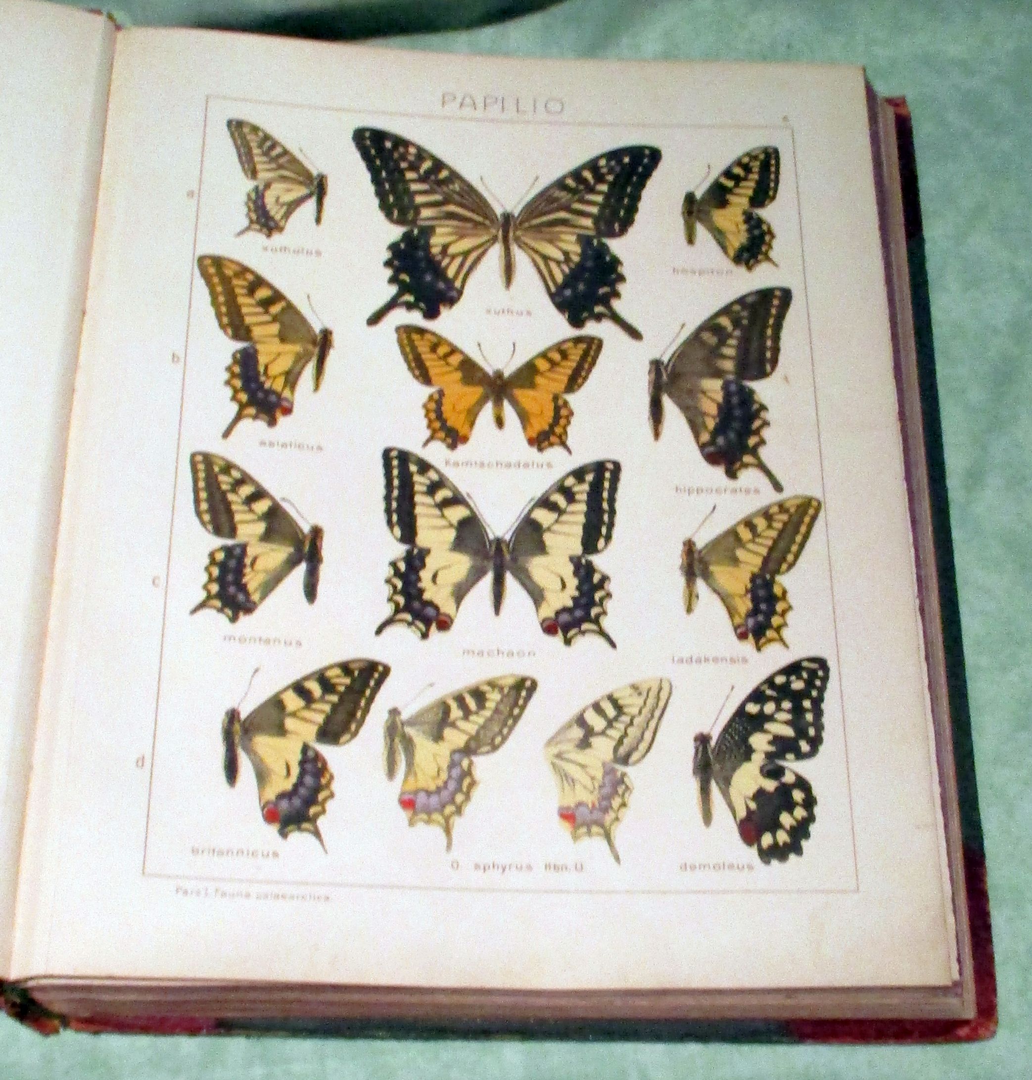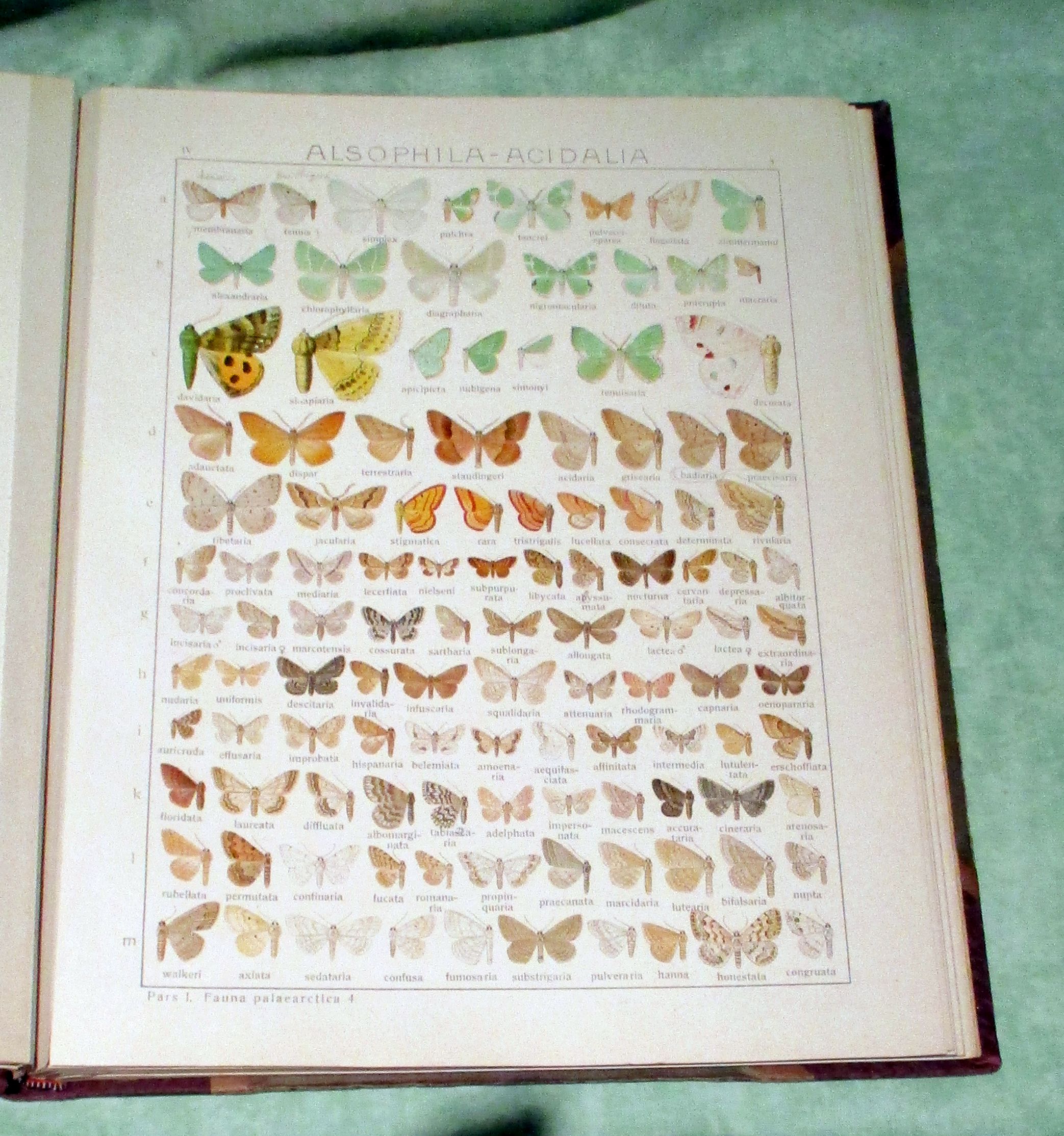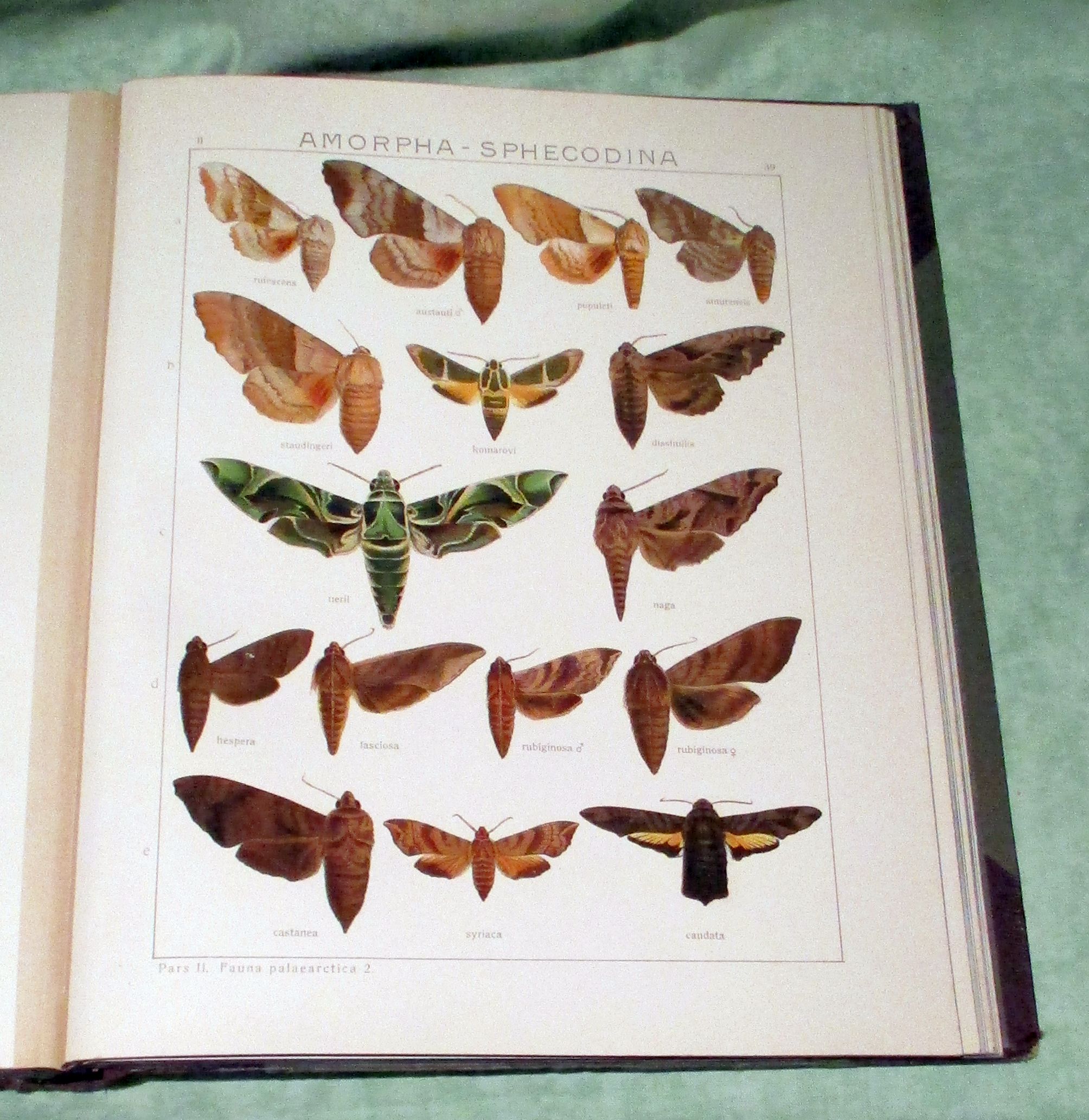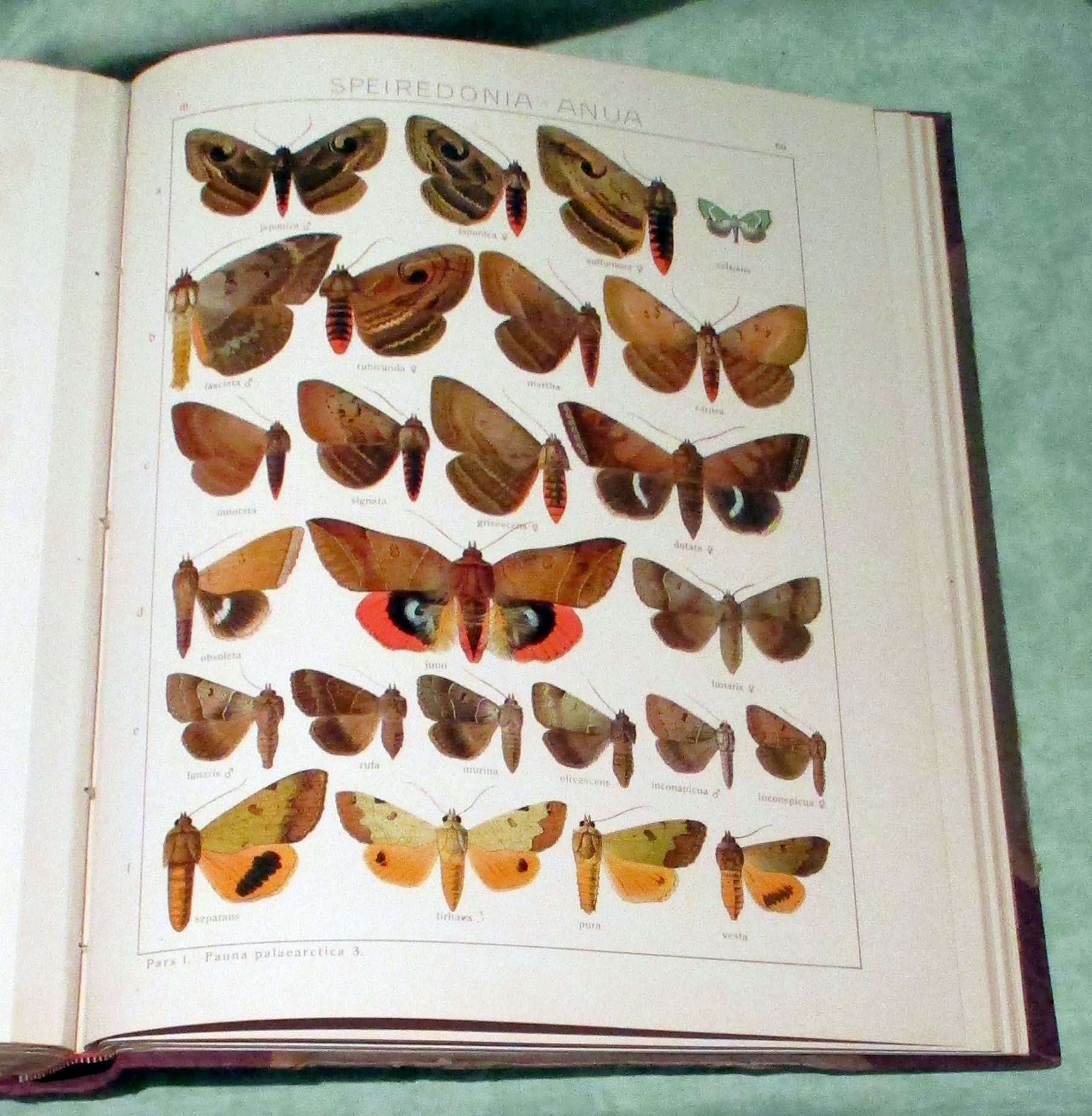 Lepidoptera – Schmetterlinge Seitz, Adalbert, Die Gross-Schmetterlinge der Erde. Eine systematische Bearbeitung der bis jetzt bekannten Gross-Schmetterlinge. I. Abteilung: Die Großschmetterlinge des Palaearktischen Faunengebietes. 1. Band: Die Palaearktischen Tagfalter. 2. Band: Die Palaearktischen Spinner & Schwärmer. 3. Band: Eulenartige Nachtfalter. 8 Bände ( 4 Text- und 4 Tafelbände) Stuttgart. Fritz Lehmann’s Verlag. 1906. Bd. 1: 379 Seiten, 89 Tafeln. Bd. 2: 478 Seiten, 56 Tafeln. Bd. 3: 511 Seiten, 75 Tafeln. Bd. 4: Spannerartge Nachtfalter. 479 Seiten,25 Tafeln. Halbleder. Komplettes Ex. mit allen Tafeln. Zum Teil unterschiedlich gebunden (Leder- und Leinenrücken) Einbände mit kleineren Gebrauchsspuren (Rücken mit Beschabungen, Ecken mit leichten Bestossungen) Bei einem Band einige Seiten mit leichten Ansätzen von Stockflecken und biliographischen Anmerkungen von kundiger alter Hand. Insgesamt ein komplettes Ex. in gutem Zustand. :
