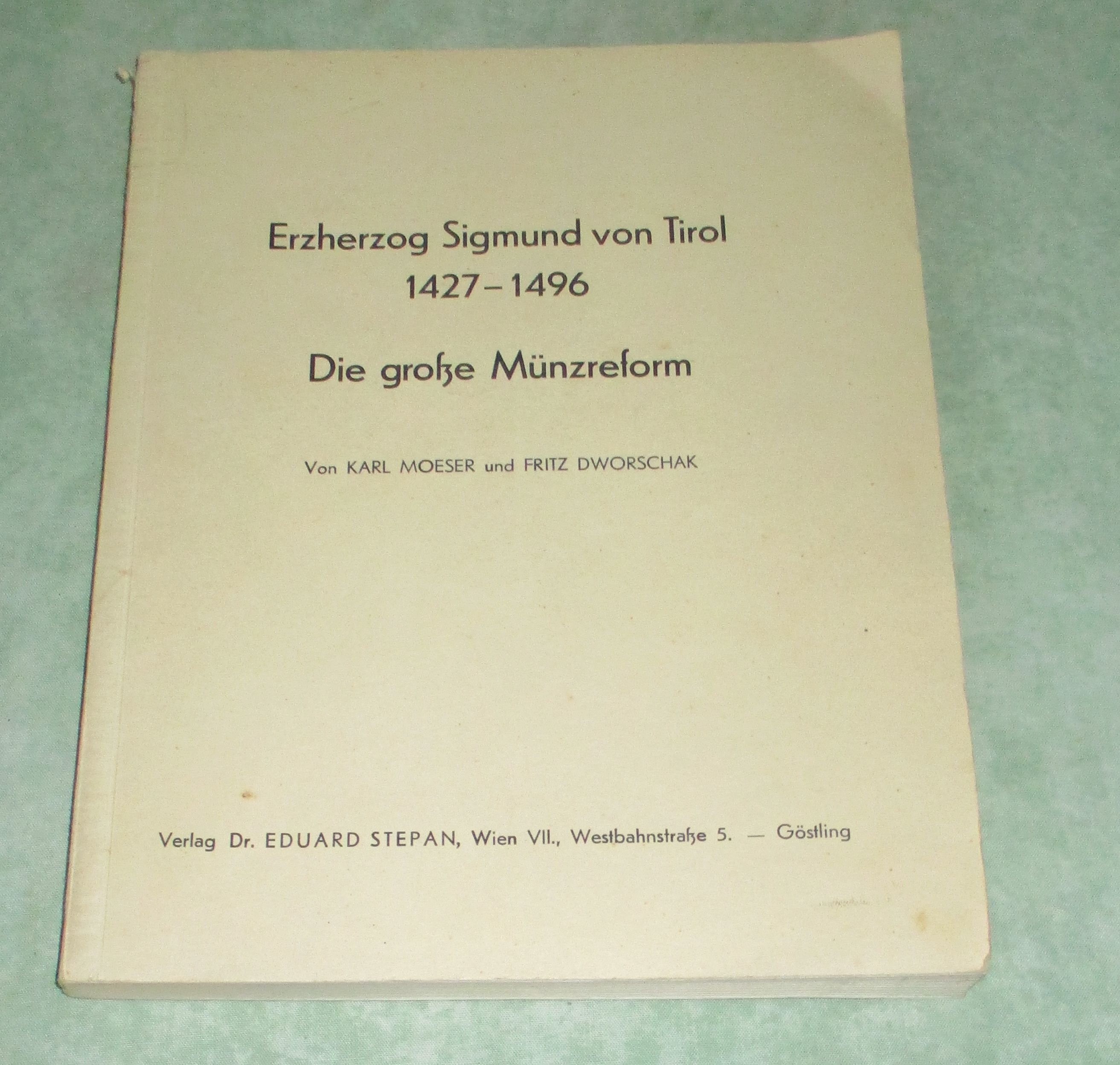 Tirol – Orts- und Landeskunde Moeser, Karl / Dworschak, Fritz. Die große Münzreform unter Erzherzog Sigmund von Tirol (Die ersten großen Silber- und deutschen Bildnismünzen aus der Münzstätte Hall im Inntal). Wien. Verlag Dr. Eduard Stepan. 1936. 4°. 175 Seiten, miit 24 Tafeln. kart. Oesterreichisches Münz- und Geldwesen im Mittelalter, Bd. 7.
