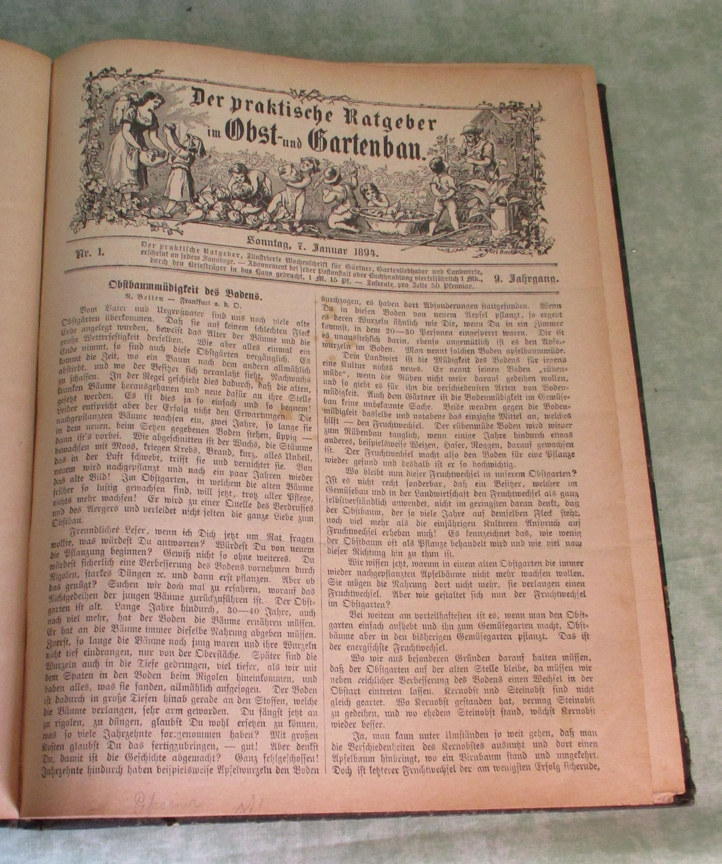 Obstbau – Pomologie Der praktische Ratgeber im Obst- und Gartenbau.Wochenschrift für Gärtner, Gartenliebhaber und Landwirte. 9. Jahrgang. 1894. 484 Seiten, zahlr. Abb. Halbleinen mit goldgepr. Rückentitel. Es fehlt ein Heft (Nr. 27).