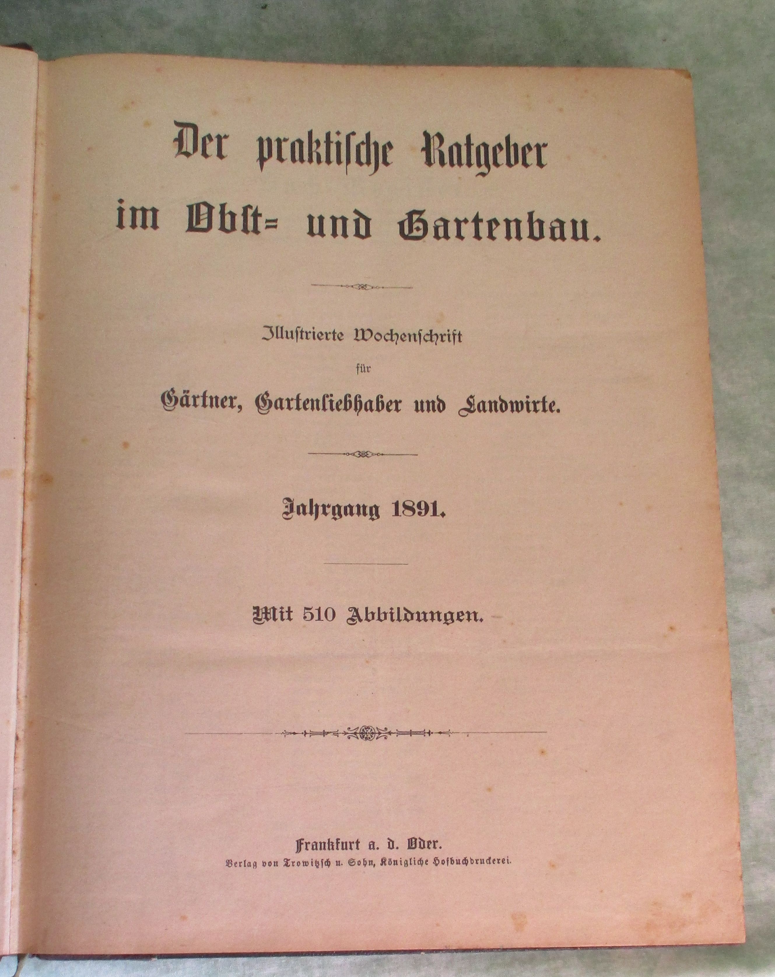 Obstbau – Pomologie Der praktische Ratgeber im Obst- und Gartenbau.Illustrierte Wochenschrift für Gärtner, Gartenliebhaber und Landwirte. 6. Jahrgang. Frankfurt/Oder. 1891. 16 Seiten (Sachregister) 488 Seiten, 510 Abb. Beigebunden: Anzeigen Teil. ca. 200 Seiten. Halbleinen mit goldgepr. Rückentitel.