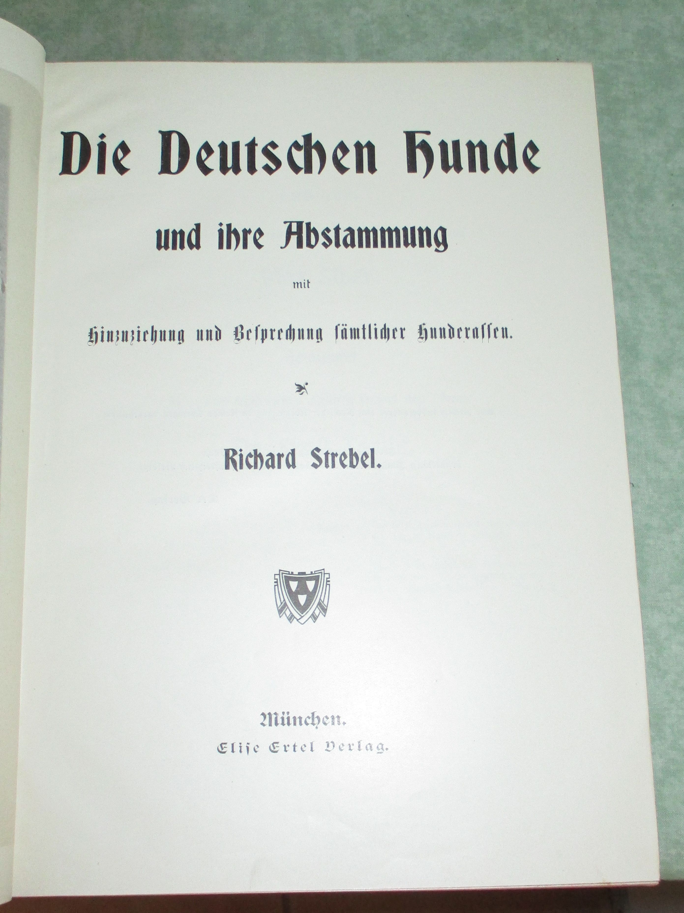 Hunde + Katzen Strebel, R. Die deutschen Hunde und ihre Abstammung mit Hinzuziehung und Besprechung sämtlicher Hunderassen. München. Elise Ertel. 1905. 4°. 343. 330 Seiten. 27 (17 farbige) Tafeln.Tierärztlicher Teil: 162 Seiten. Originalleinen. Am Vorsatz eine Widmung von alter Hand. Ansonsten ein makelloses Exemplar der Originalausgabe.