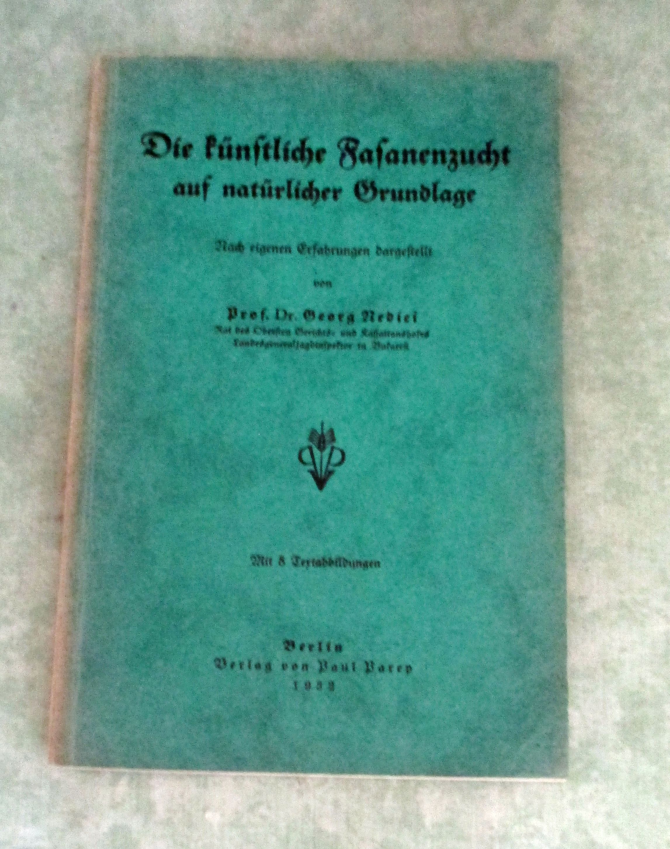 Stubenvögel-, Geflügel-, und Taubenliteratur Nedici, Gheorghe:. Die künstliche Fasanenzucht auf natürlicher Grundlage. Berlin. Parey. 1932. 8. 83 Seiten, mit 8 Textabb. kart. Gutes Ex.!