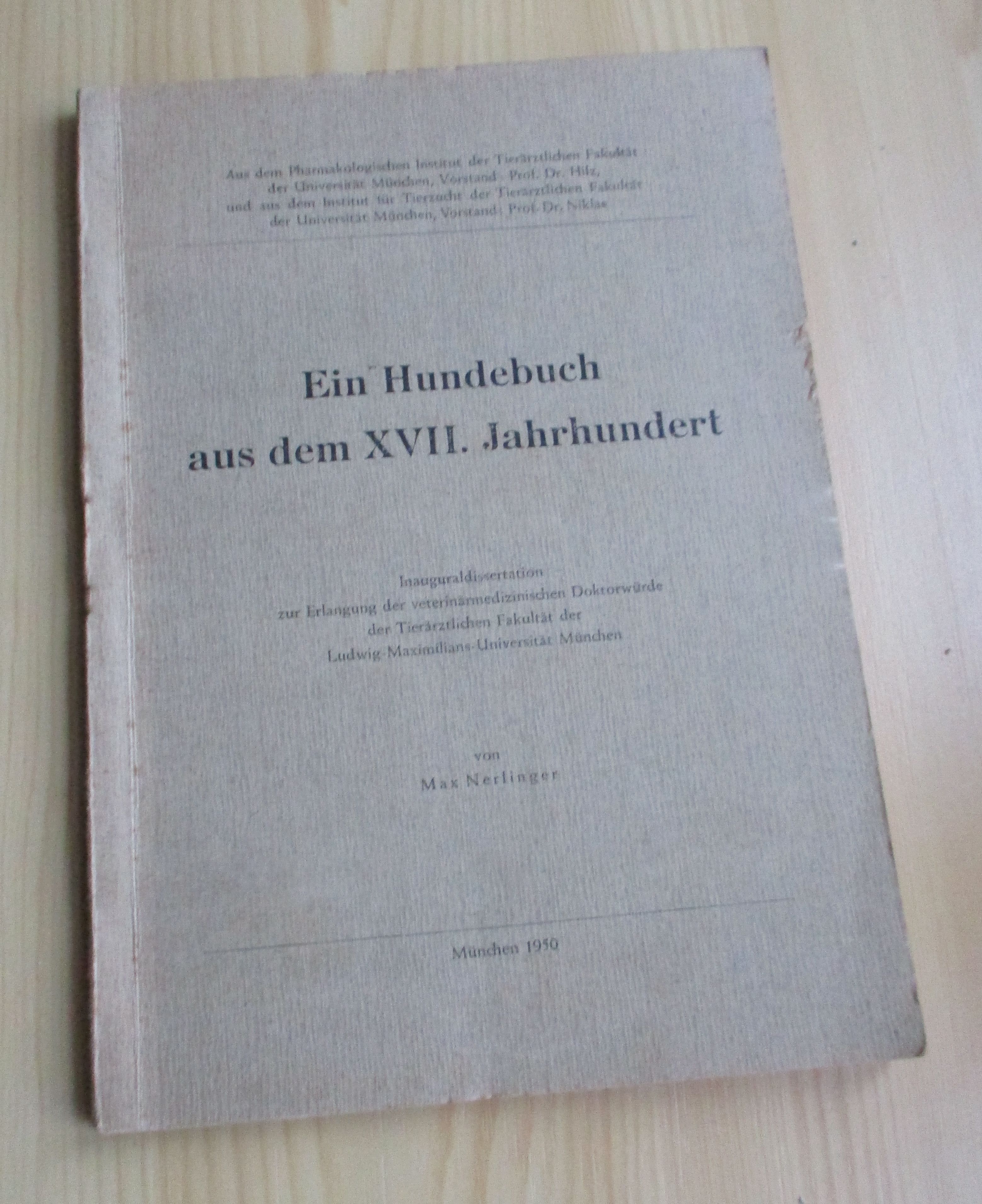 Hunde + Katzen Nerlinger, Max. Ein Hundebuch aus dem XVII. Jahrhundert. München. 1950. 70 Seiten. kart. Dissertation über das Buch „Cynographia curiosa oder Hundebeschreibung“ von Christian Franz Paullini, das 1685 im Verlag von Johann Georg Endter in Nürnberg erschienen ist.