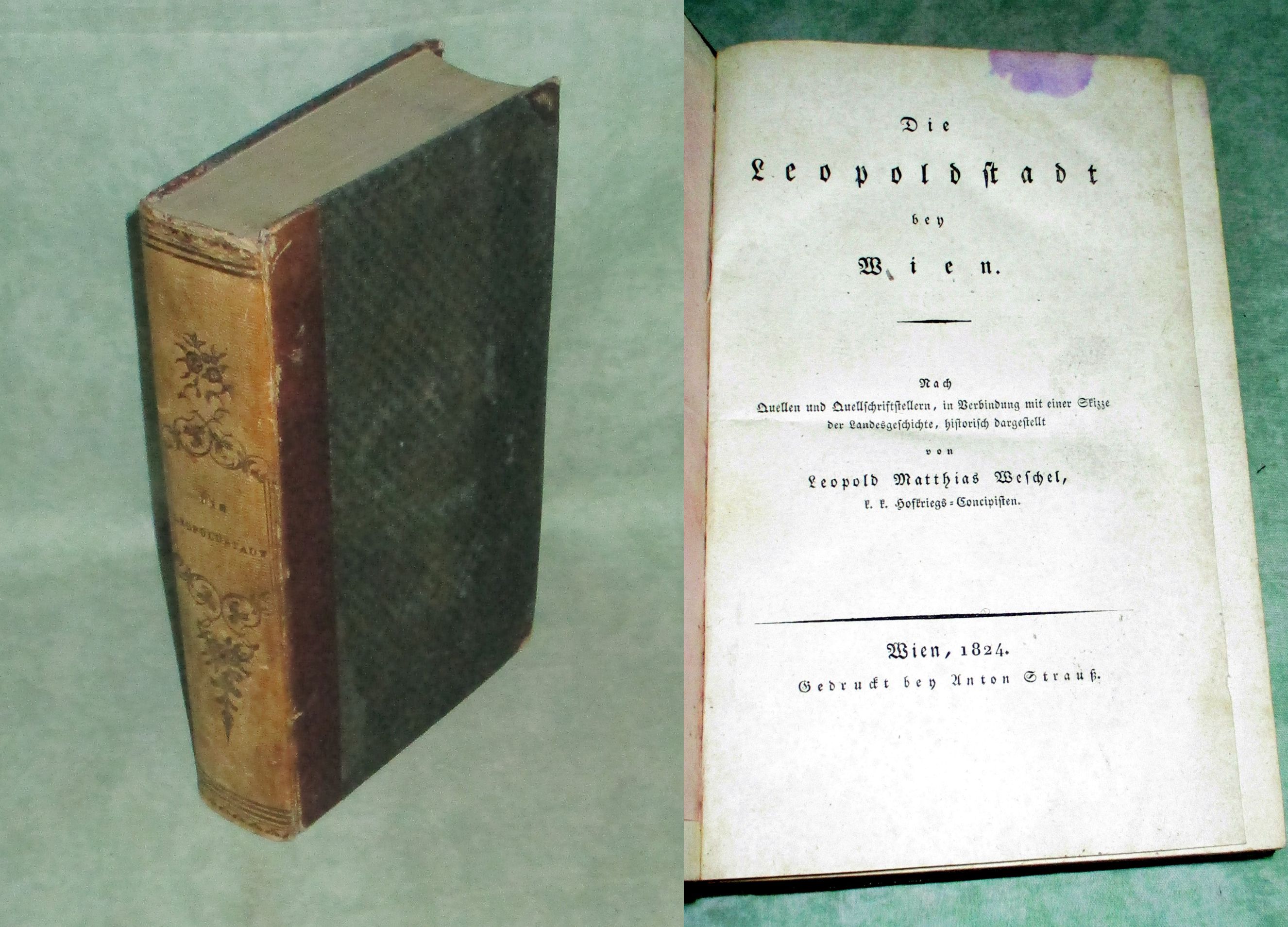 Wien – Landeskunde Weschel, Leopold Matthias. Die Leopoldstadt bey Wien. Nach Quellen u. Quellschriftstellern in Verbindunge mit einer Skizze der Landesgeschichte historisch dargestellt. Wien. 1824. VIII, 597, XCVII Seiten. Frontispiz: Bildnis Joseph des II. (Stahlstich) Halbleder. Einband leicht berieben und bestossen, kleiner lila Fleck am oberen Rand im unbedruckten Bereich auf den ersten Seite, ansonsten sauberund stockfleckenfrei. . Insgesamt ein gutes Ex. Mit Urkundenbuch und einem Verzeichnis der Straßen und Häuser (mit magistratischen Konskriptionsnummern).