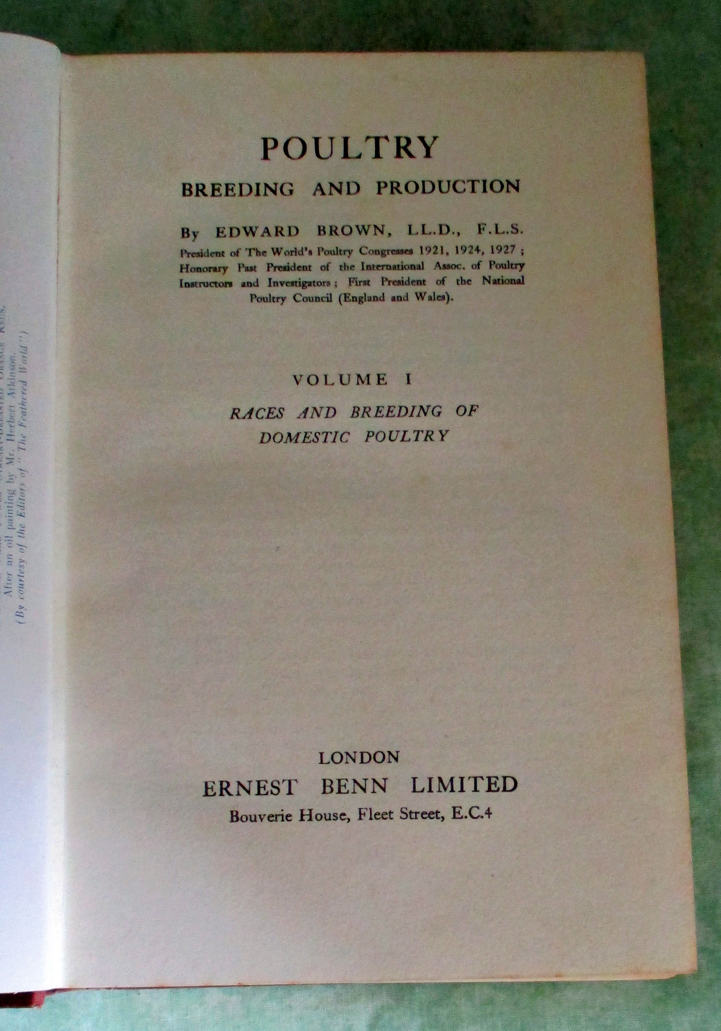 Stubenvögel-, Geflügel-, und Taubenliteratur Brown, Edward: Poultry. Breeding and Production. Vol. I: Races and breeding of domestic poultry. vol. II: The lines of development. London. Ernest Benn. 1929. 864 Seiten, 104 (8 farbige) Abb. Goldgepr. Leinen. In gutem Erhaltungzustand.