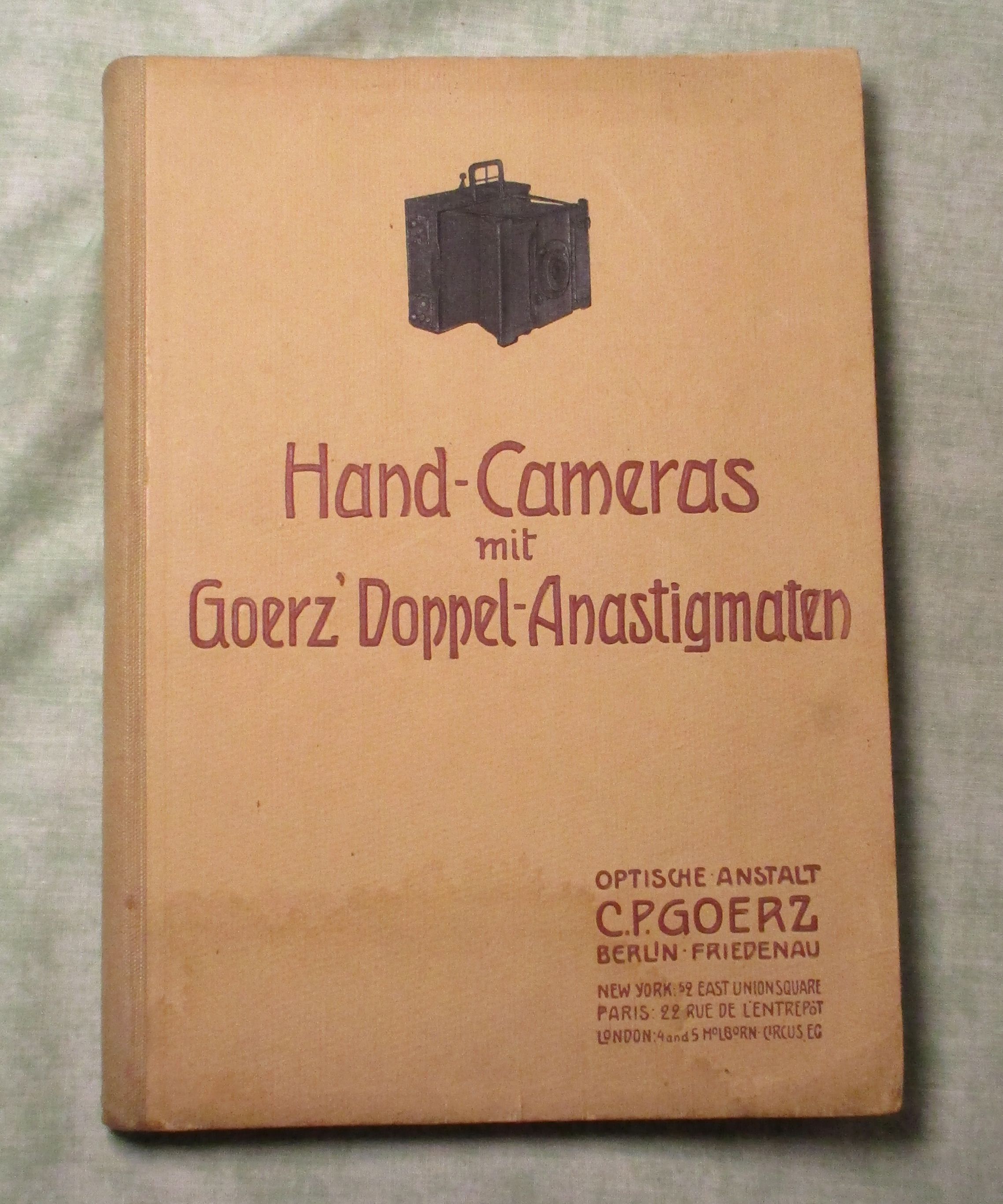 Fotografie Optische Anstalt C.P. Goerz – Berlin Friedenau. Photographische Hand-Apparate ausgerüstet mit Goerz’ Doppelanastigmaten. Appareils photographique à main munis de Doubles Anastigmats Goerz – Photographic Hand Cameras fitted with Goerz’s Double Anastigmatic Lenses. um 1900.. 239 Seiten, durchgehend illustriert. Halbleinen. Einband leicht fleckig, innen sauber, insgesamt in gutem Zustand. Abteilung I: Magazin Cameras Abteilung II: Klapp-Cameras Abteilung III: Spiegel- (Reflex-) Cameras Abteilung IV: Film- Cameras für Tageslicht-Wechselung – Abteilung V: Cameras besonder Konstruktion.