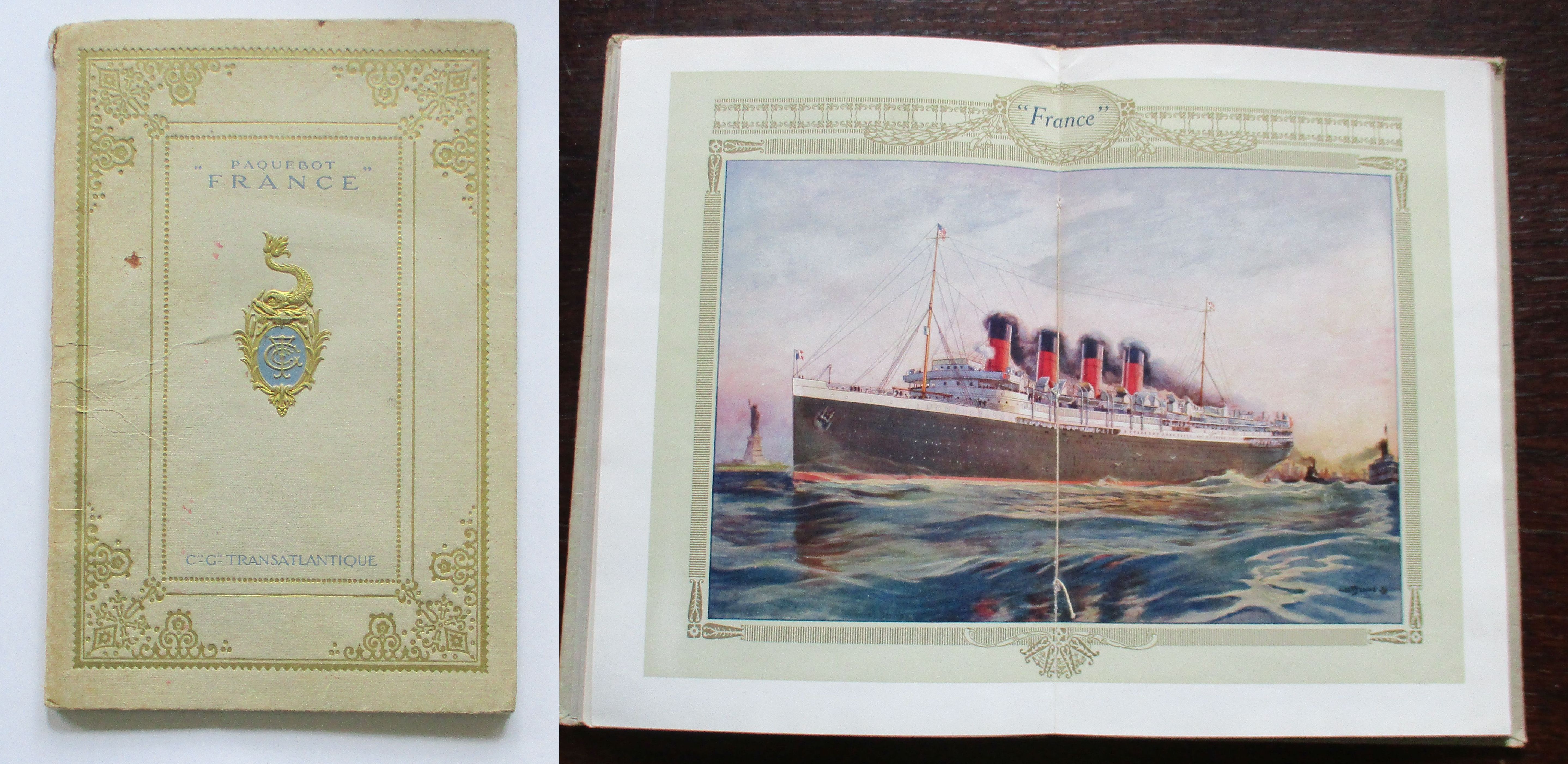 Marinegeschichte – Schiffe + Schifffahrt Le Nouveau Paquebot „France“ de la Compagnie Génerérale Transantlantique. 1912. 35 Seiten, mit zahlr. Fotos (Kabinen, Maschinenraum, Salons usw.) und einem doppelblattgrossen farbigen Bilde des Dampfers. Fest gebunden. Mit goldgepr. Einband. Einband mit leichten Gebrauchsspuren. In französischer Sprache.