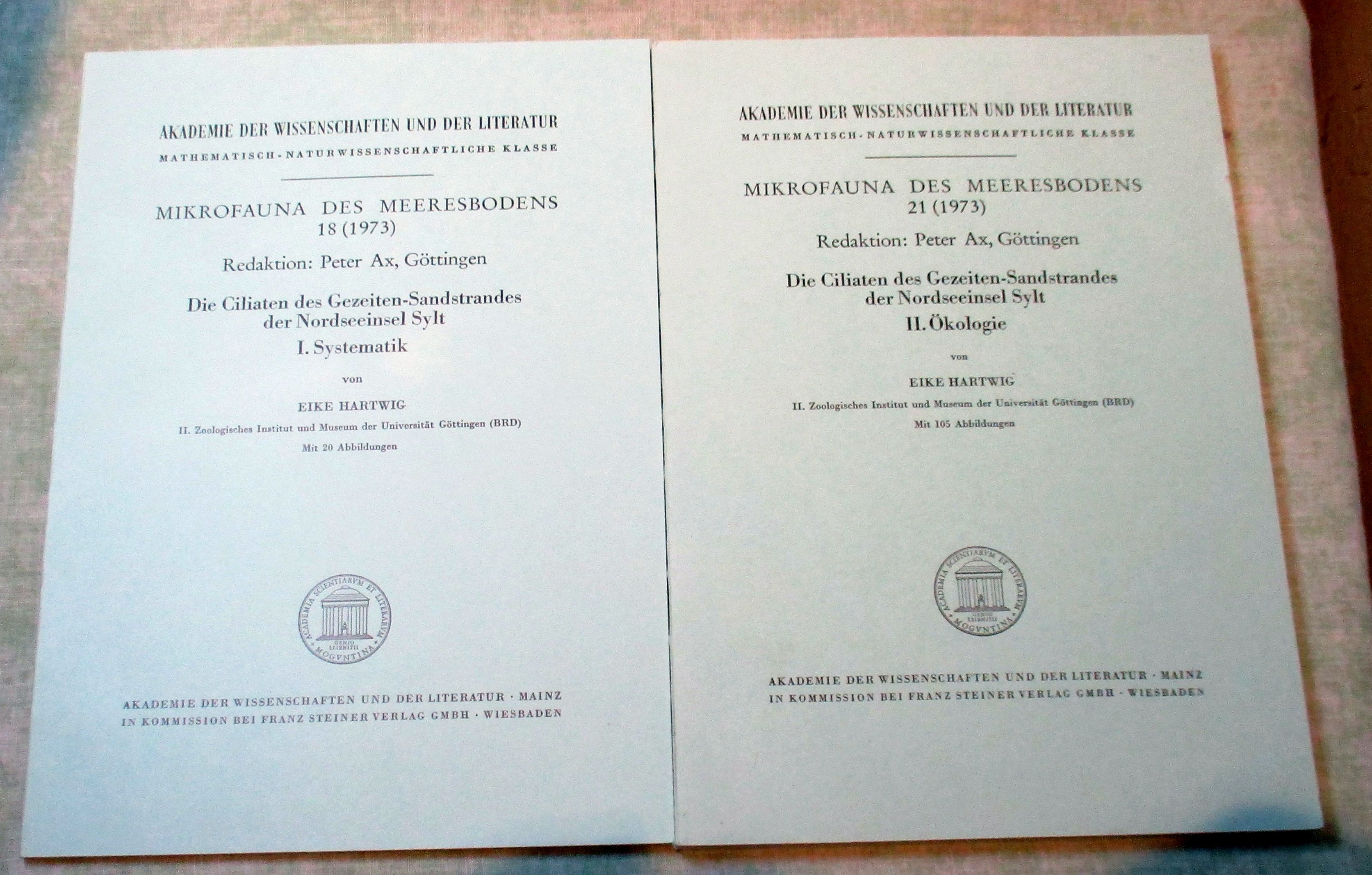 Meeresbiologie + Limnologie + Hydrobiologie Hartwig, Eike. Die Ciliaten des Gezeiten-Sandstrandes der Nordseeinsel Sylt. I, Systematik II. Ökologie, Mainz, Akad. der Wiss. und Lit., 69. 171 Seiten. insges. 125 Textillustr. kart. Mikrofauna des Meeresbodens 18.