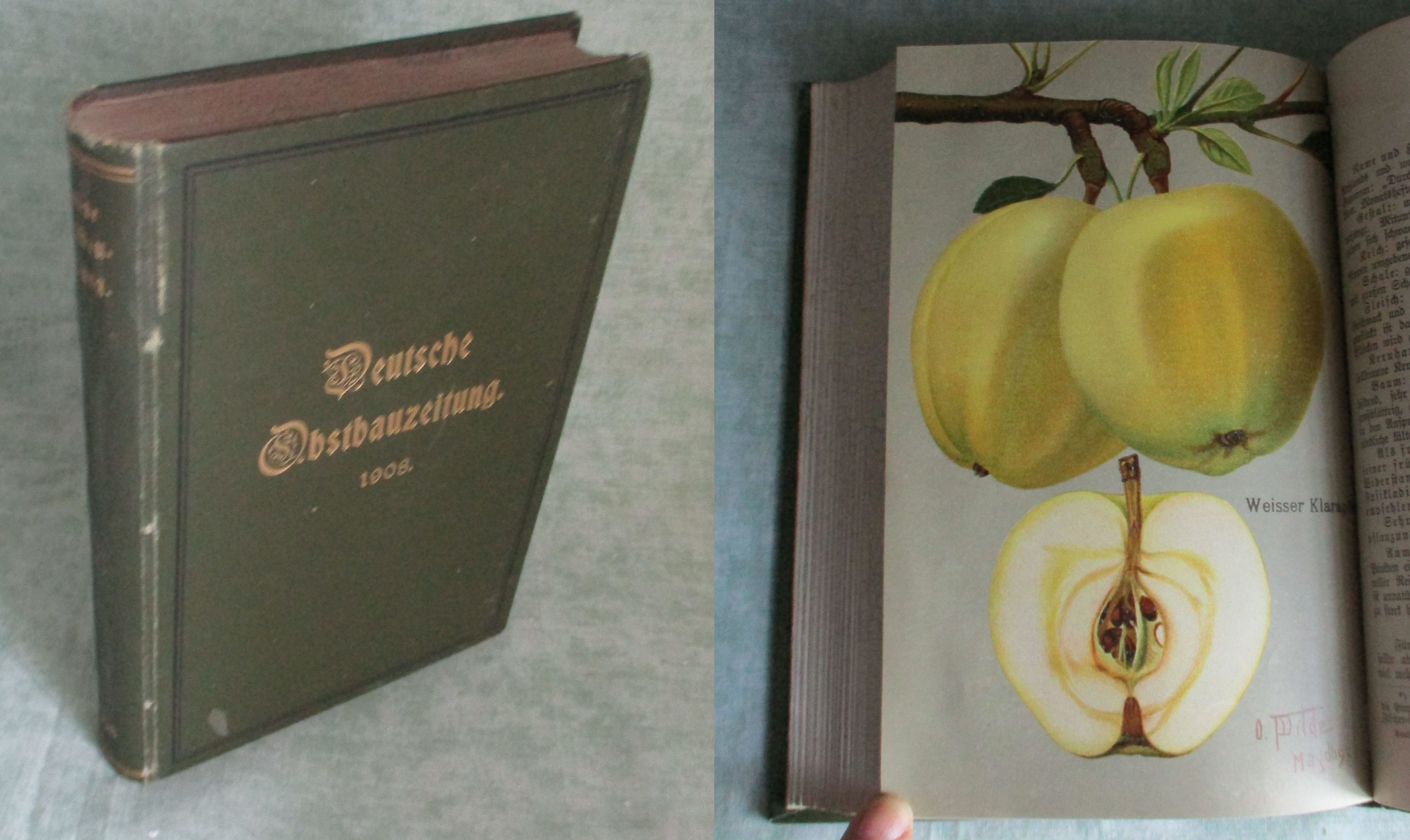 Obstbau – Pomologie Deutsche Obstbauzeitung. Jahrgang 1906. (54. Jahrgang der Pomologischen Monatshefte). Hrsg. vom Vorstand des Deutschen Pomologen-Vereines in Eisenach. Stuttgart, Ulmer. X. 400 Seiten, 6 farbige, chromlithogr. Tafeln, s/w Tafeln und Textabb. Originalleinen mit goldgepr. Titel und marmoriertem Schnitt. Einband an Ecken und Kanten minimal berieben und bestossen, insgesamt ein gutes Ex.