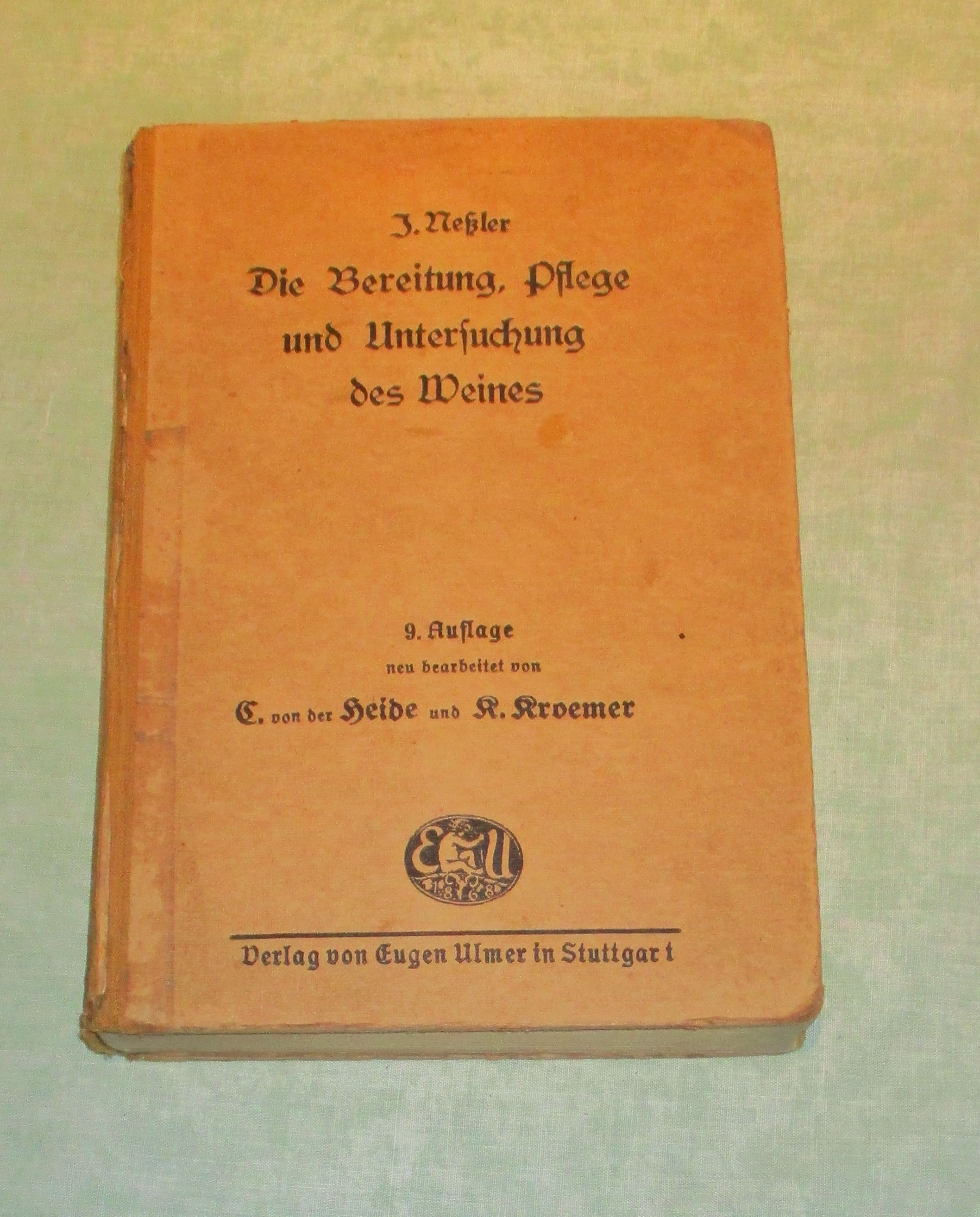 Wein – Weinbau Neßler, Julius: Die Bereitung, Pflege und Untersuchung des Weines. 9. Auflage. Stuttgart. Ulmer, 1930. XII, 535 Seiten Illustrationen. Halbleinen. Einband berieben, Ecken bestossen. Rückenkanten angeplatzt, innen sauber und anstreichungsfrei.