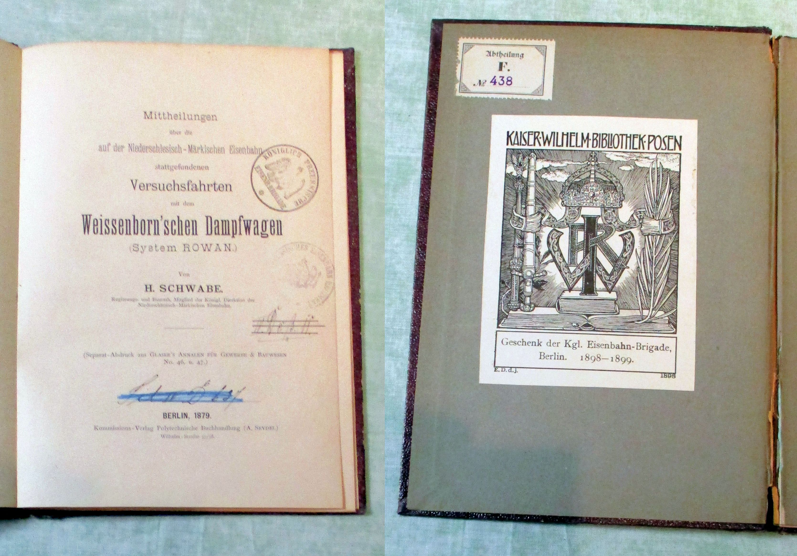 Eisenbahn Schwabe, H. Mittheilungen über die auf der Niederschlesisch-Märkischen Eisenbahn stattgefunden Versuchsfahrten mit dem Weissenborn’schen Dampfwagen (System ROWAN) Berlin. 1879. 24 Seiten. 2 Tafeln mit Ansichten des Weissenborn’schen Dampfwagens. Halbleder. Einband stark berieben und bestossen. Mehrere Stempel der „Königlich Preussischen Eisenbahnbrigade“. am Titel und Vorsatz. Separat-Abdruck aus Glaser’s Annalen für Gewerbe und Bauwesen.“ Der Weißenborn’sche Dampfwagen war eine frühe Form eines Schienenfahrzeugs mit Dampfantrieb, das um 1879 in Berlin eingesetzt wurde. Er kann als eine Art frühe Dampfstraßenbahn beschrieben werden und verfügte über drei Passagierklassen.