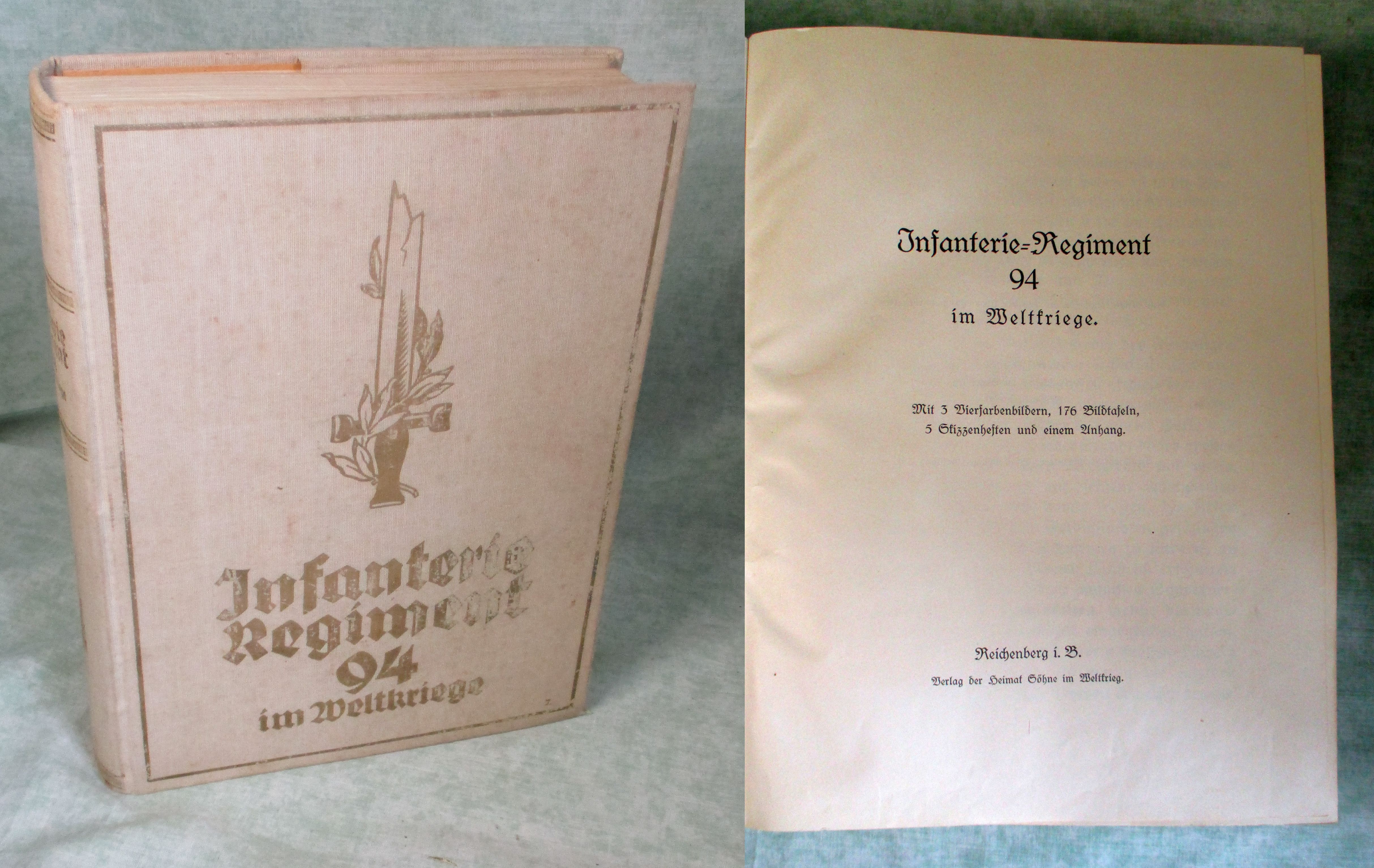 Österr. Heeres- + Marinegeschichte Infanterie-Regiment 94 im Weltkriege. Mit 3 Vierfarbenbildern, 176 Bildtafeln, 5 Skizzenheften und einem Anhang. Reichenberg i. Böhmen. Verlag der Heimat Söhne im Weltkrieg. (1929) – (1933). 823, XXXII S., 87 Tafeln, 5 Beilagen. Goldgepr. Originalleinen. Einband berieben, kleine Vorbesitzerstempel auf den Vorsätzen. Innen sauber und anstreichungsfrei.